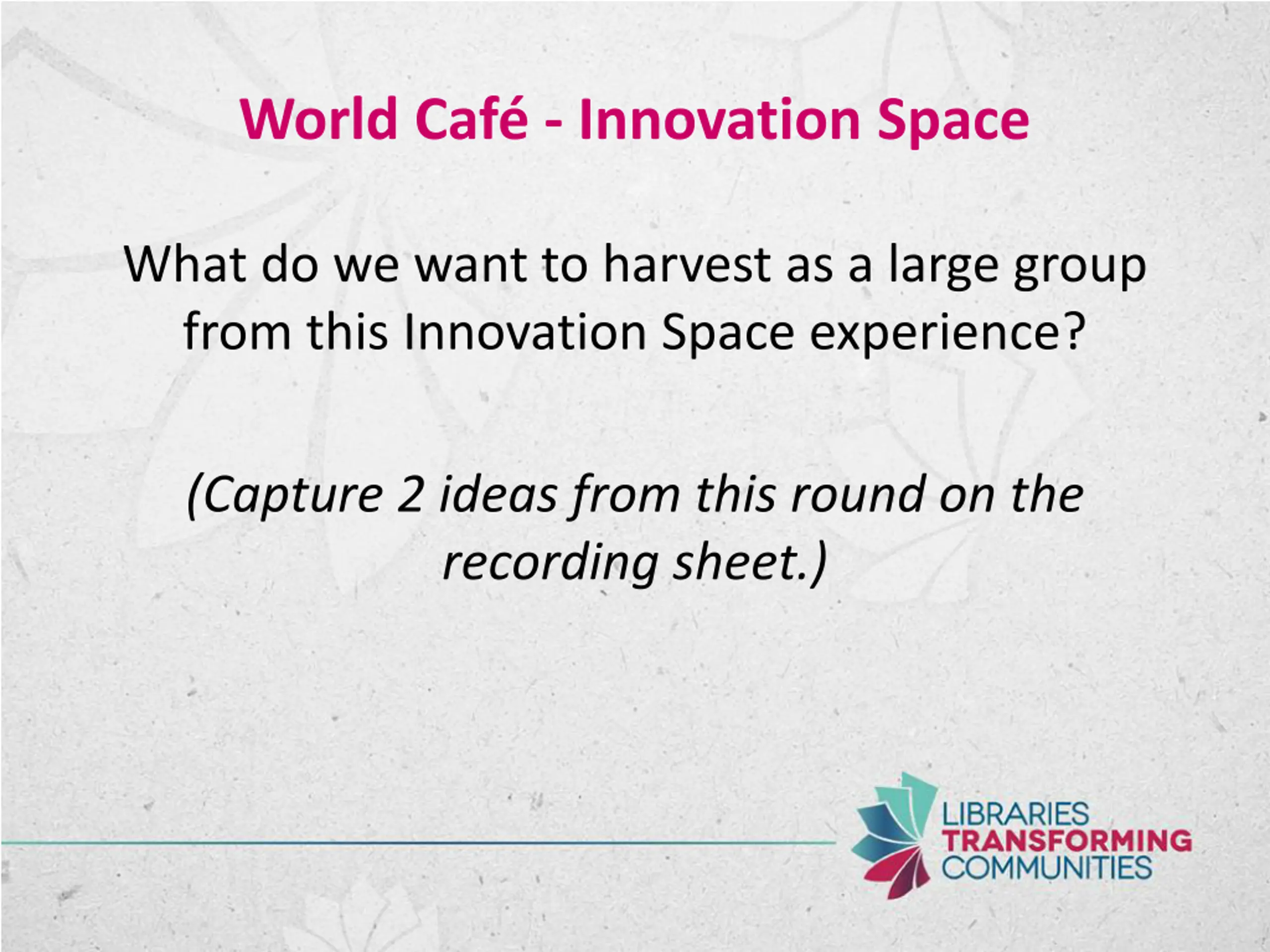 World Caf - Innovation Space What do we want to harvest as a large group from this Innovation Space experience? (Capture 2 ideas from this round on the recording sheet.)