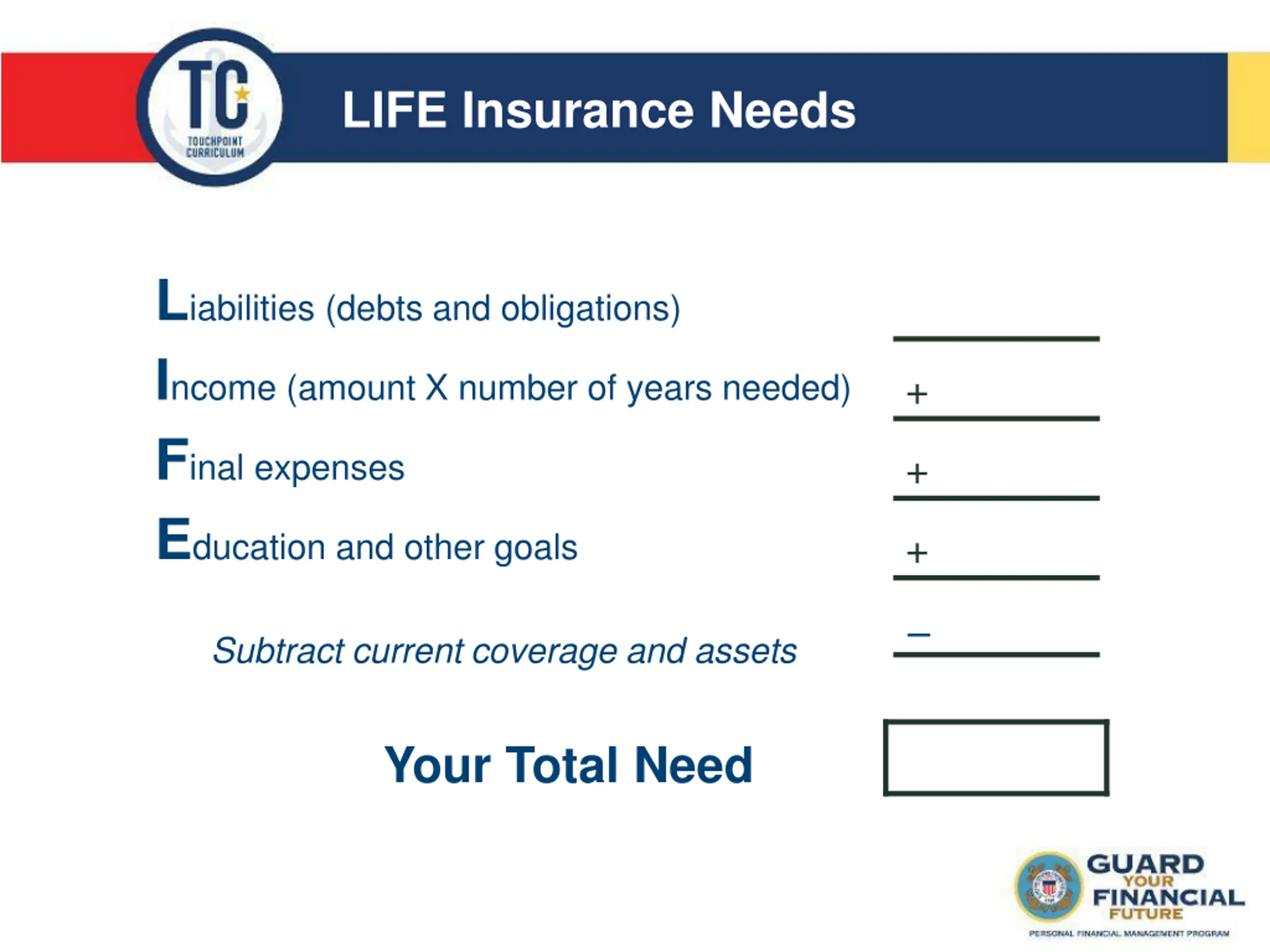 LIFE Insurance Needs Liabilities (debts and obligations) Income (amount X number of years needed) Final expenses Education and other goals + + + Subtract current coverage and assets Your Total Need Internal