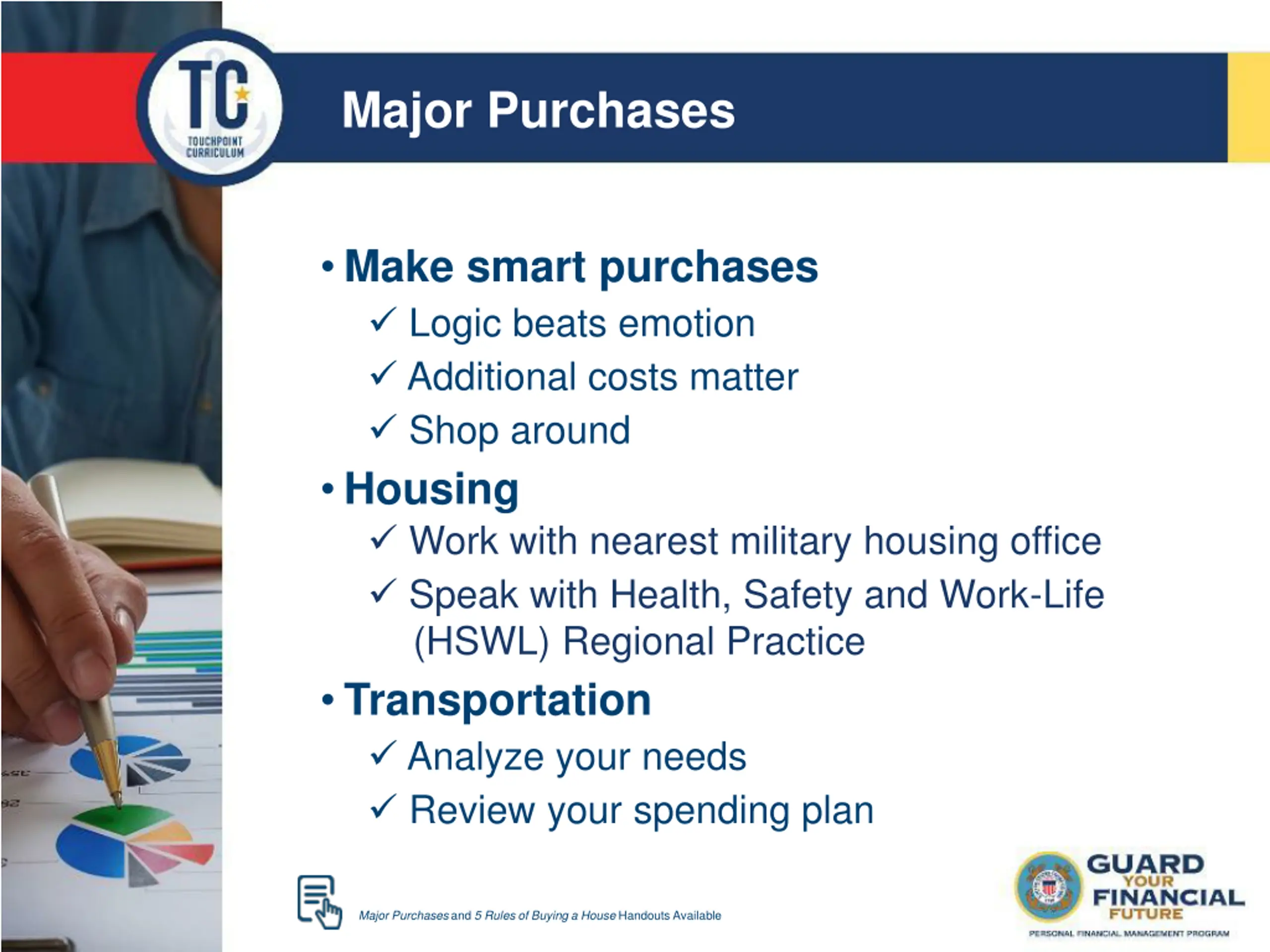 Major Purchases Make smart purchases Logic beats emotion Additional costs matter Shop around Housing Work with nearest military housing office Speak with Health, Safety and Work-Life (HSWL) Regional Practice Transportation Analyze your needs Review your spending plan Major Purchases and 5 Rules of Buying a House Handouts Available Internal