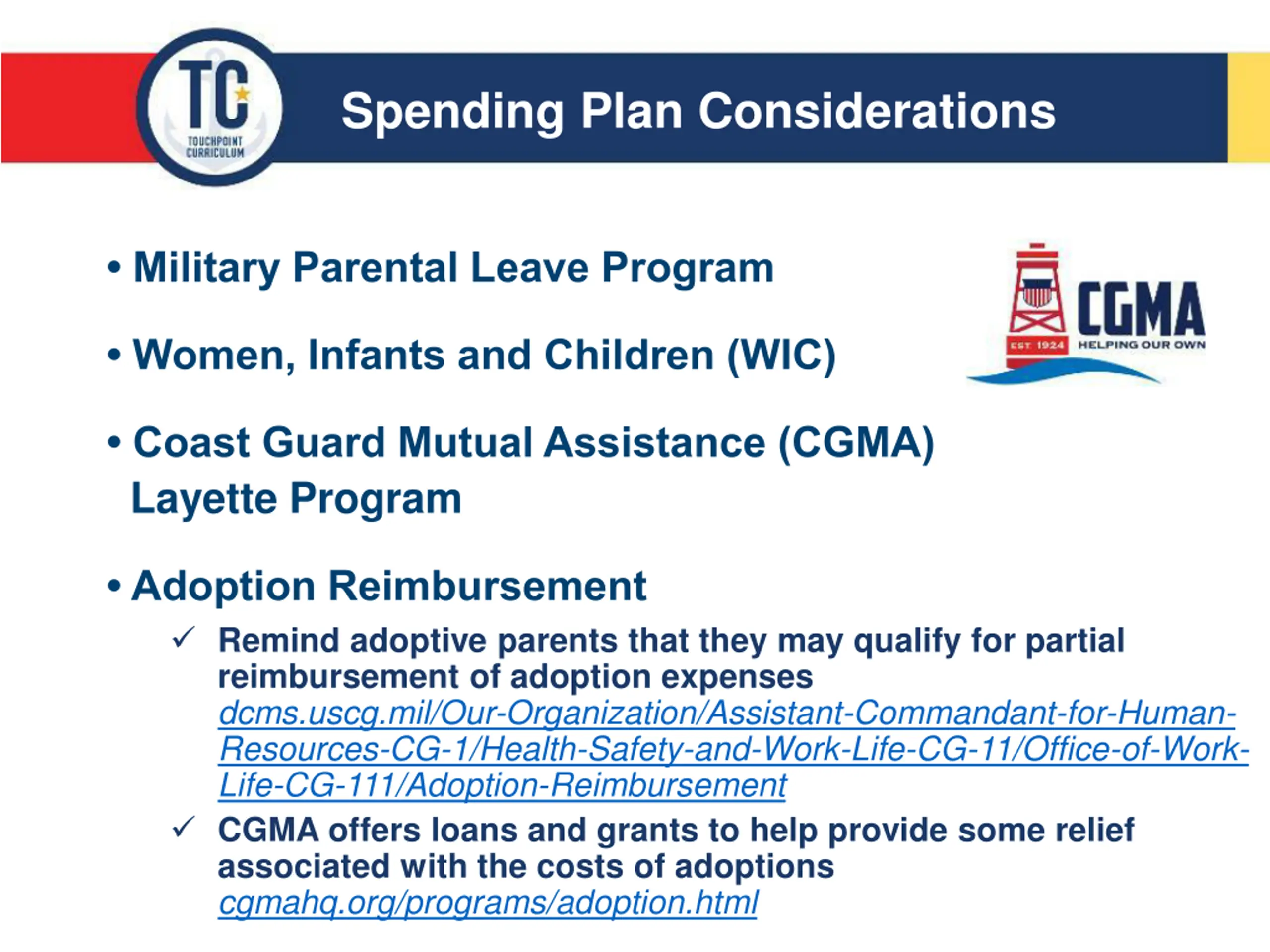Spending Plan Considerations Military Parental Leave Program Women, Infants and Children (WIC) Coast Guard Mutual Assistance (CGMA) Layette Program Adoption Reimbursement Remind adoptive parents that they may qualify for partial reimbursement of adoption expenses dcms.uscg.mil/Our-Organization/Assistant-Commandant-for-Human- Resources-CG-1/Health-Safety-and-Work-Life-CG-11/Office-of-Work- Life-CG-111/Adoption-Reimbursement CGMA offers loans and grants to help provide some relief associated with the costs of adoptions cgmahq.org/programs/adoption.html Internal