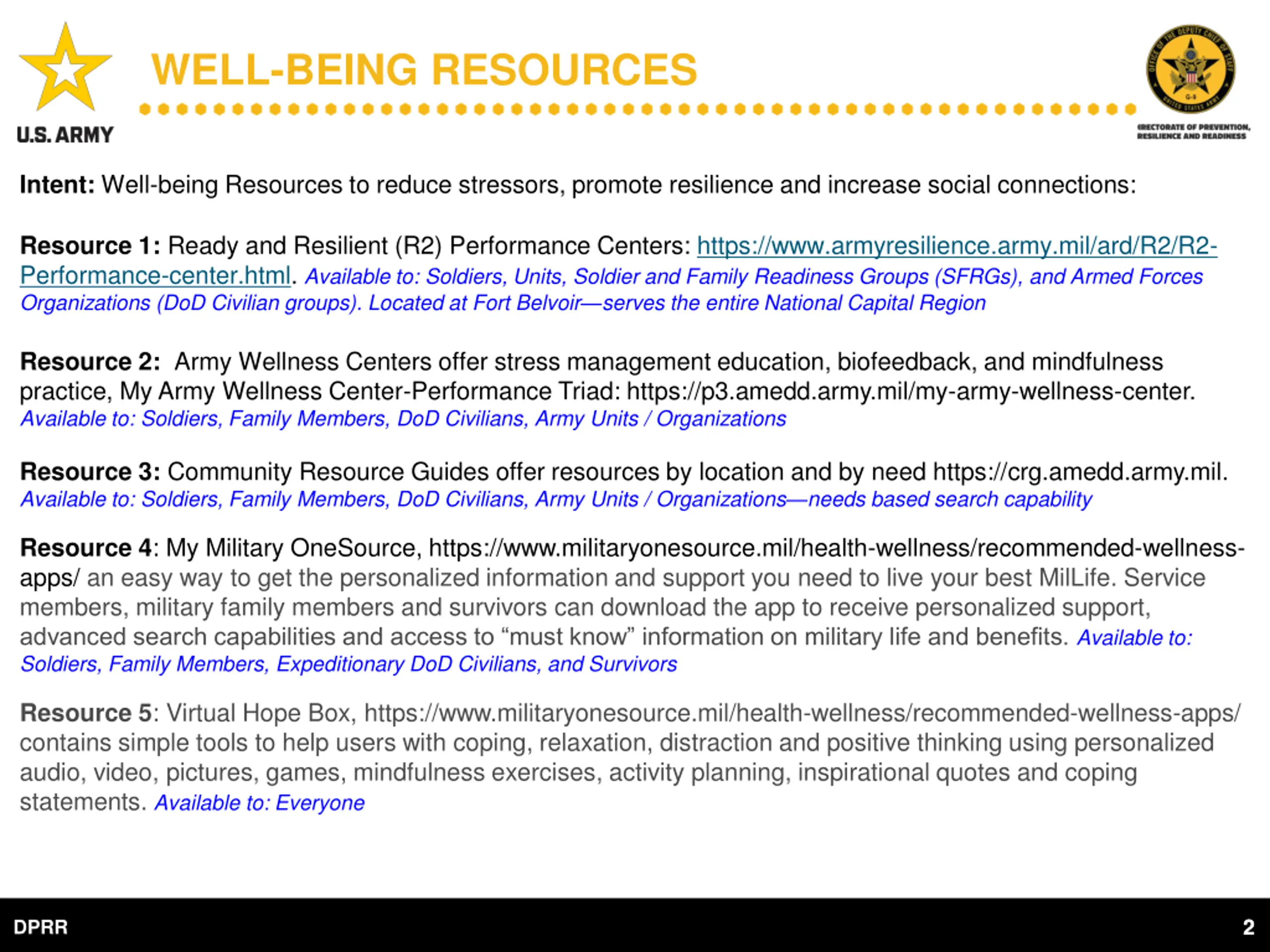 WELL-BEING RESOURCES Intent: Well-being Resources to reduce stressors, promote resilience and increase social connections: Resource 1: Ready and Resilient (R2) Performance Centers: https://www.armyresilience.army.mil/ard/R2/R2- Performance-center.html.Available to: Soldiers, Units, Soldier and Family Readiness Groups (SFRGs), and Armed Forces Organizations (DoD Civilian groups). Located at Fort Belvoir serves the entire National Capital Region Resource 2: Army Wellness Centers offer stress management education, biofeedback, and mindfulness practice, My Army Wellness Center-Performance Triad: https://p3.amedd.army.mil/my-army-wellness-center. Available to: Soldiers, Family Members, DoD Civilians, Army Units / Organizations Resource 3: Community Resource Guides offer resources by location and by need https://crg.amedd.army.mil. Available to: Soldiers, Family Members, DoD Civilians, Army Units / Organizations needs based search capability Resource 4: My Military OneSource, https://www.militaryonesource.mil/health-wellness/recommended-wellness- apps/ an easy way to get the personalized information and support you need to live your best MilLife. Service members, military family members and survivors can download the app to receive personalized support, advanced search capabilities and access to must know information on military life and benefits.Available to: Soldiers, Family Members, Expeditionary DoD Civilians, and Survivors Resource 5: Virtual Hope Box, https://www.militaryonesource.mil/health-wellness/recommended-wellness-apps/ contains simple tools to help users with coping, relaxation, distraction and positive thinking using personalized audio, video, pictures, games, mindfulness exercises, activity planning, inspirational quotes and coping statements.Available to: Everyone CUI 2 2 DPRR