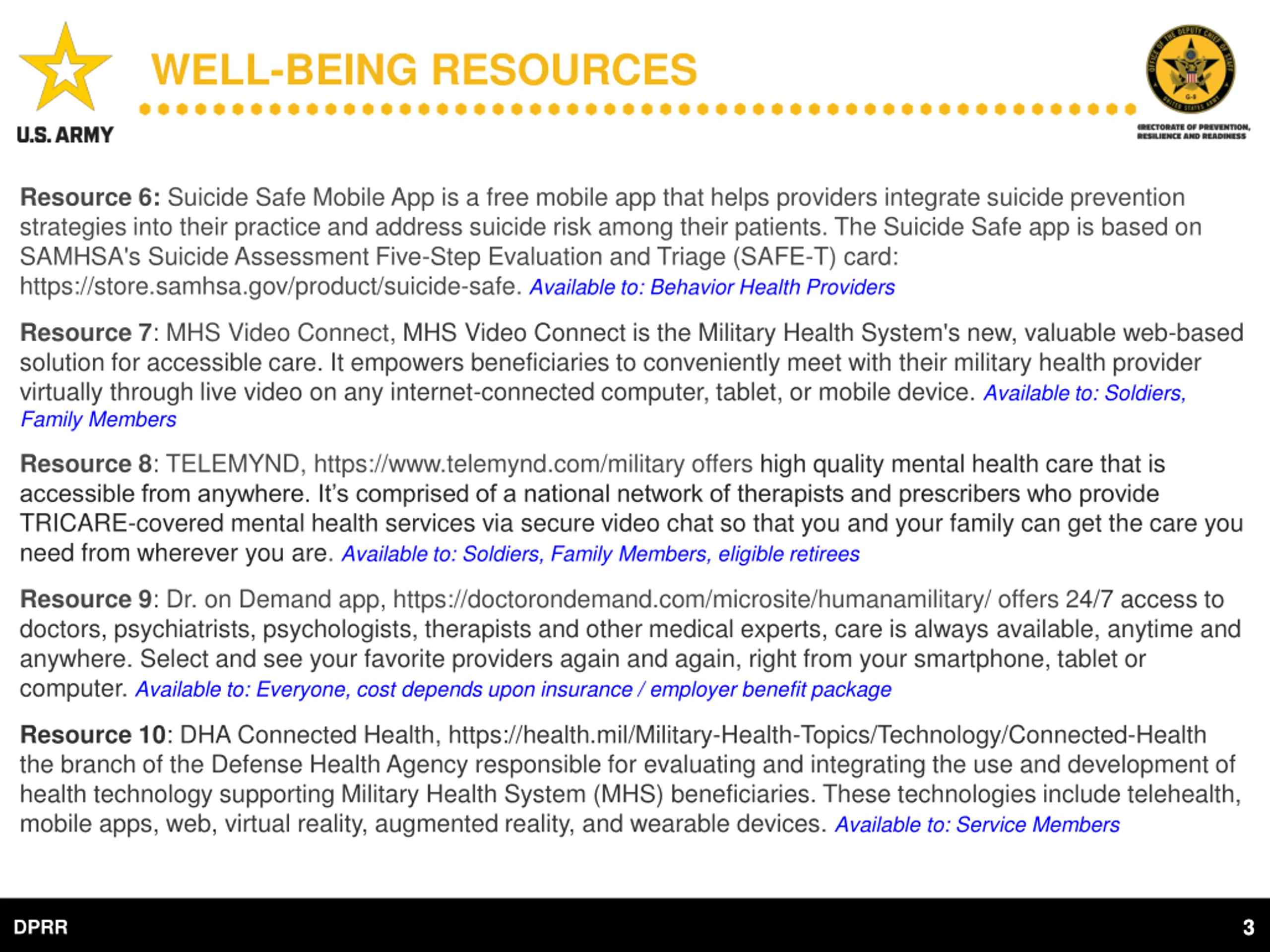 WELL-BEING RESOURCES Resource 6: Suicide Safe Mobile App is a free mobile app that helps providers integrate suicide prevention strategies into their practice and address suicide risk among their patients. The Suicide Safe app is based on SAMHSA's Suicide Assessment Five-Step Evaluation and Triage (SAFE-T) card: https://store.samhsa.gov/product/suicide-safe.Available to: Behavior Health Providers Resource 7: MHS Video Connect, MHS Video Connect is the Military Health System's new, valuable web-based solution for accessible care. It empowers beneficiaries to conveniently meet with their military health provider virtually through live video on any internet-connected computer, tablet, or mobile device.Available to: Soldiers, Family Members Resource 8: TELEMYND, https://www.telemynd.com/military offers high quality mental health care that is accessible from anywhere. It s comprised of a national network of therapists and prescribers who provide TRICARE-covered mental health services via secure video chat so that you and your family can get the care you need from wherever you are.Available to: Soldiers, Family Members, eligible retirees Resource 9: Dr. on Demand app, https://doctorondemand.com/microsite/humanamilitary/ offers 24/7 access to doctors, psychiatrists, psychologists, therapists and other medical experts, care is always available, anytime and anywhere. Select and see your favorite providers again and again, right from your smartphone, tablet or computer.Available to: Everyone, cost depends upon insurance / employer benefit package Resource 10: DHA Connected Health, https://health.mil/Military-Health-Topics/Technology/Connected-Health the branch of the Defense Health Agency responsible for evaluating and integrating the use and development of health technology supporting Military Health System (MHS) beneficiaries. These technologies include telehealth, mobile apps, web, virtual reality, augmented reality, and wearable devices.Available to: Service Members CUI 3 3 DPRR