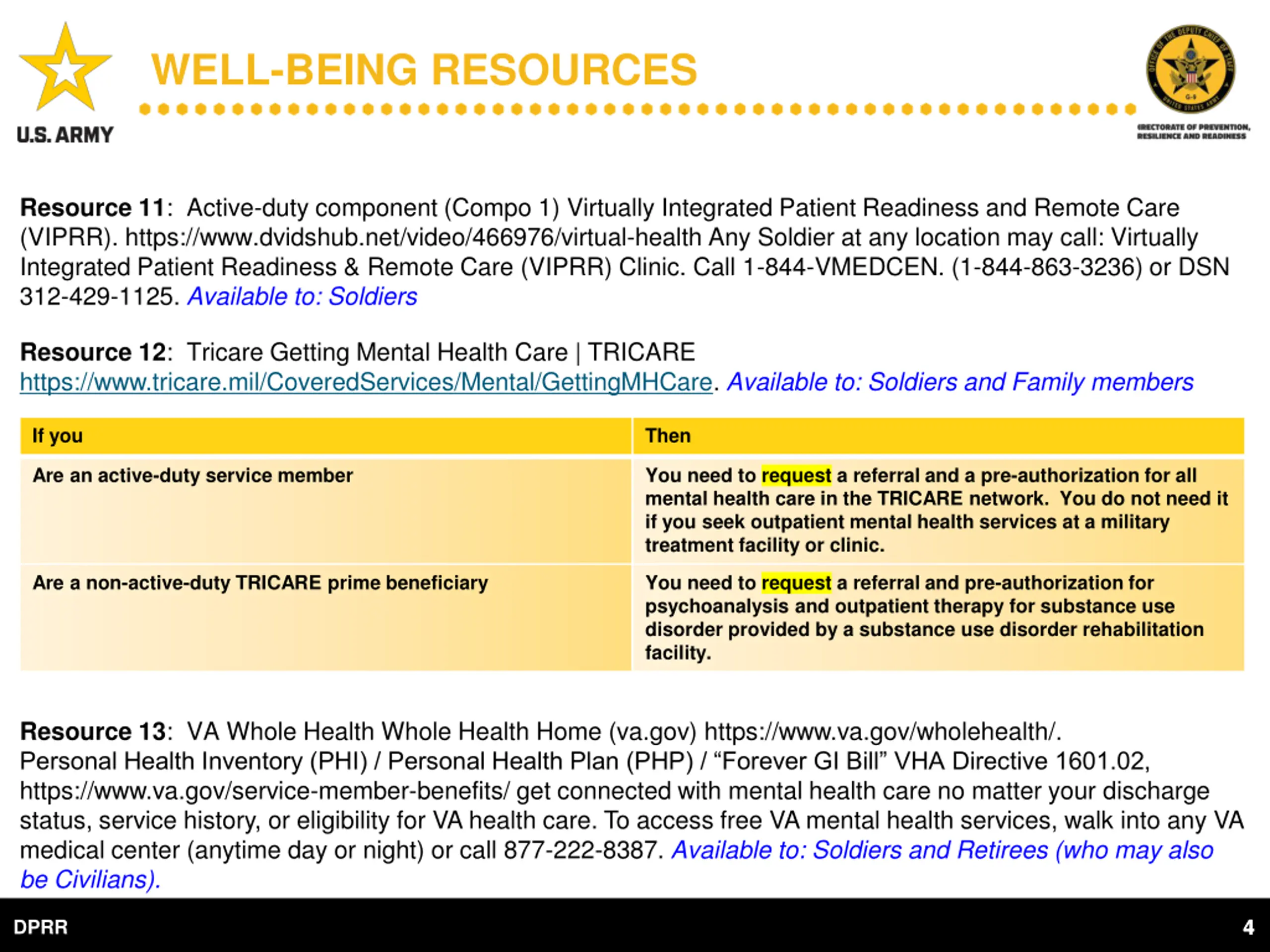 WELL-BEING RESOURCES Resource 11: Active-duty component (Compo 1) Virtually Integrated Patient Readiness and Remote Care (VIPRR). https://www.dvidshub.net/video/466976/virtual-health Any Soldier at any location may call: Virtually Integrated Patient Readiness & Remote Care (VIPRR) Clinic. Call 1-844-VMEDCEN. (1-844-863-3236) or DSN 312-429-1125. Available to: Soldiers Resource 12: Tricare Getting Mental Health Care | TRICARE https://www.tricare.mil/CoveredServices/Mental/GettingMHCare. Available to: Soldiers and Family members If you Then Are an active-duty service member You need to request a referral and a pre-authorization for all mental health care in the TRICARE network. You do not need it if you seek outpatient mental health services at a military treatment facility or clinic. Are a non-active-duty TRICARE prime beneficiary You need to request a referral and pre-authorization for psychoanalysis and outpatient therapy for substance use disorder provided by a substance use disorder rehabilitation facility. Resource 13: VA Whole Health Whole Health Home (va.gov) https://www.va.gov/wholehealth/. Personal Health Inventory (PHI) / Personal Health Plan (PHP) / Forever GI Bill VHA Directive 1601.02, https://www.va.gov/service-member-benefits/ get connected with mental health care no matter your discharge status, service history, or eligibility for VA health care. To access free VA mental health services, walk into any VA medical center (anytime day or night) or call 877-222-8387. Available to: Soldiers and Retirees (who may also be Civilians). CUI 4 4 DPRR