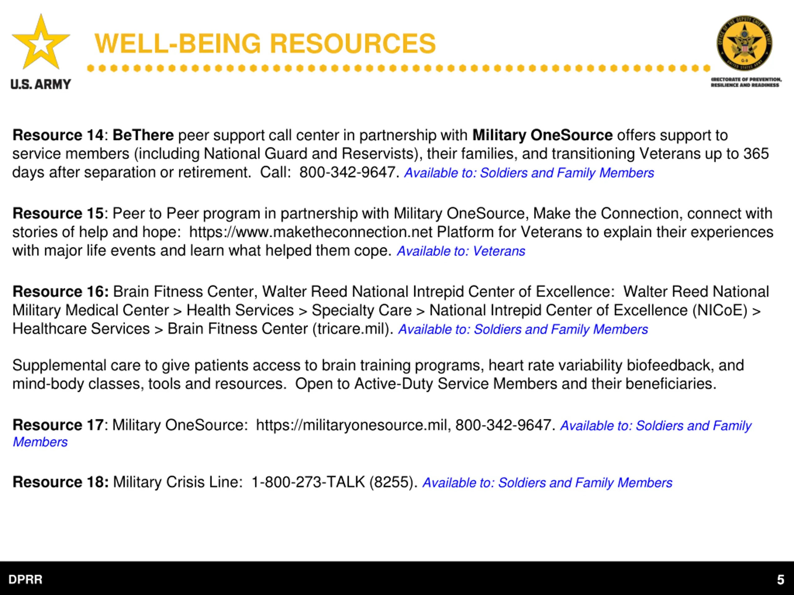 WELL-BEING RESOURCES Resource 14: BeThere peer support call center in partnership with Military OneSource offers support to service members (including National Guard and Reservists), their families, and transitioning Veterans up to 365 days after separation or retirement. Call: 800-342-9647.Available to: Soldiers and Family Members Resource 15: Peer to Peer program in partnership with Military OneSource, Make the Connection, connect with stories of help and hope: https://www.maketheconnection.net Platform for Veterans to explain their experiences with major life events and learn what helped them cope. Available to: Veterans Resource 16: Brain Fitness Center, Walter Reed National Intrepid Center of Excellence: Walter Reed National Military Medical Center > Health Services > Specialty Care > National Intrepid Center of Excellence (NICoE) > Healthcare Services > Brain Fitness Center (tricare.mil).Available to: Soldiers and Family Members Supplemental care to give patients access to brain training programs, heart rate variability biofeedback, and mind-body classes, tools and resources. Open to Active-Duty Service Members and their beneficiaries. Resource 17: Military OneSource: https://militaryonesource.mil, 800-342-9647.Available to: Soldiers and Family Members Resource 18: Military Crisis Line: 1-800-273-TALK (8255). Available to: Soldiers and Family Members CUI 5 5 DPRR
