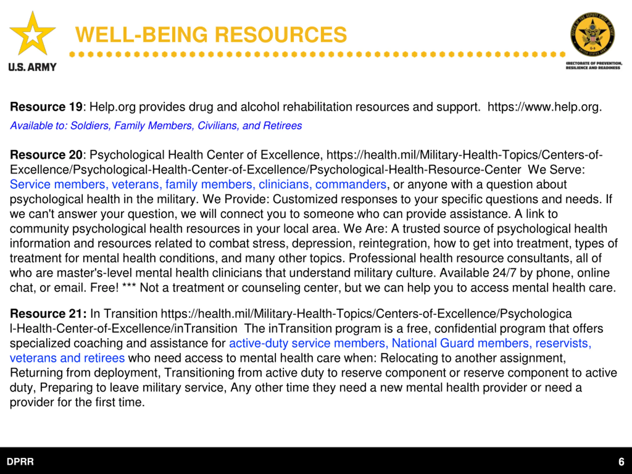 WELL-BEING RESOURCES Resource 19: Help.org provides drug and alcohol rehabilitation resources and support. https://www.help.org. Available to: Soldiers, Family Members, Civilians, and Retirees Resource 20: Psychological Health Center of Excellence, https://health.mil/Military-Health-Topics/Centers-of- Excellence/Psychological-Health-Center-of-Excellence/Psychological-Health-Resource-Center We Serve: Service members, veterans, family members, clinicians, commanders, or anyone with a question about psychological health in the military. We Provide: Customized responses to your specific questions and needs. If we can't answer your question, we will connect you to someone who can provide assistance. A link to community psychological health resources in your local area. We Are: A trusted source of psychological health information and resources related to combat stress, depression, reintegration, how to get into treatment, types of treatment for mental health conditions, and many other topics. Professional health resource consultants, all of who are master's-level mental health clinicians that understand military culture. Available 24/7 by phone, online chat, or email. Free! *** Not a treatment or counseling center, but we can help you to access mental health care. Resource 21: In Transition https://health.mil/Military-Health-Topics/Centers-of-Excellence/Psychologica l-Health-Center-of-Excellence/inTransition The inTransition program is a free, confidential program that offers specialized coaching and assistance for active-duty service members, National Guard members, reservists, veterans and retirees who need access to mental health care when: Relocating to another assignment, Returning from deployment, Transitioning from active duty to reserve component or reserve component to active duty, Preparing to leave military service, Any other time they need a new mental health provider or need a provider for the first time. CUI 6 6 DPRR