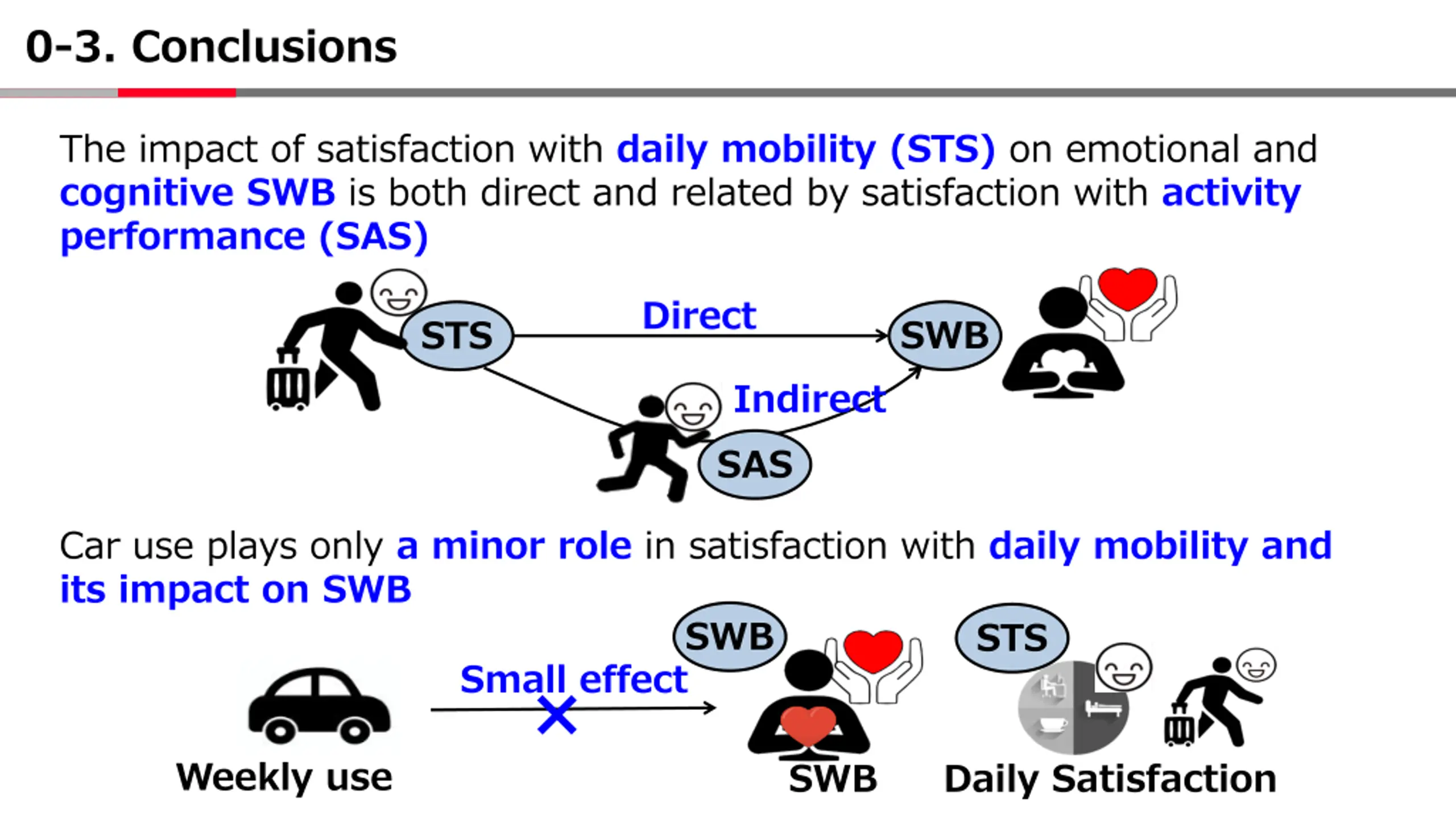 0-3. Conclusions The impact of satisfaction with daily mobility (STS) on emotional and cognitive SWB is both direct and related by satisfaction with activity performance (SAS) Direct SWB STS Indirect SAS Car use plays only a minor role in satisfaction with daily mobility and its impact on SWB SWB STS Small effect Weekly use SWB Daily Satisfaction