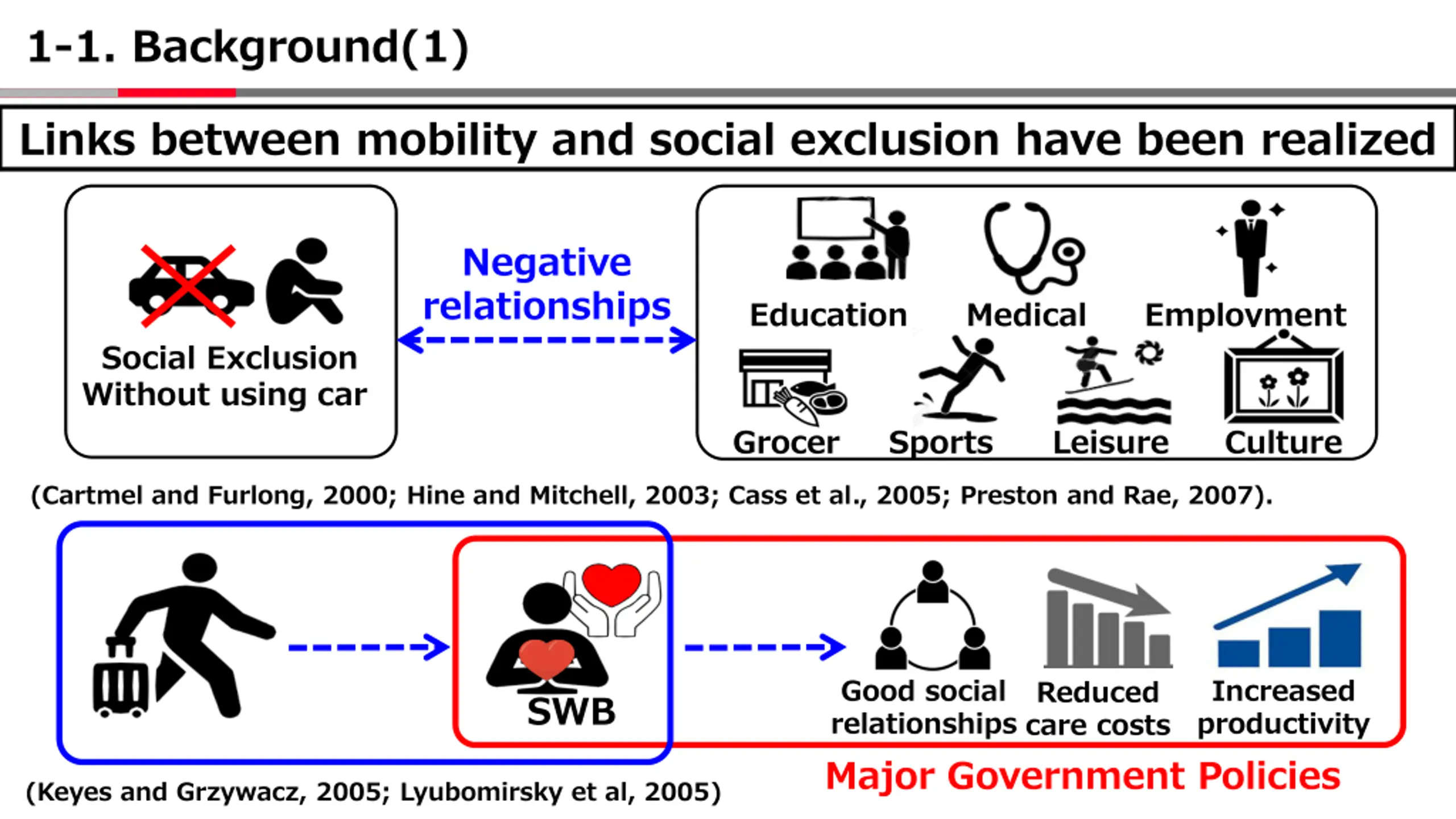 1-1. Background(1) Links between mobility and social exclusion have been realized Negative relationships Education Medical Employment Social Exclusion Without using car Grocer Sports Leisure Culture (Cartmel and Furlong, 2000; Hine and Mitchell, 2003; Cass et al., 2005; Preston and Rae, 2007). Good social relationships Major Government Policies Increased productivity Reduced care costs SWB (Keyes and Grzywacz, 2005; Lyubomirsky et al, 2005)