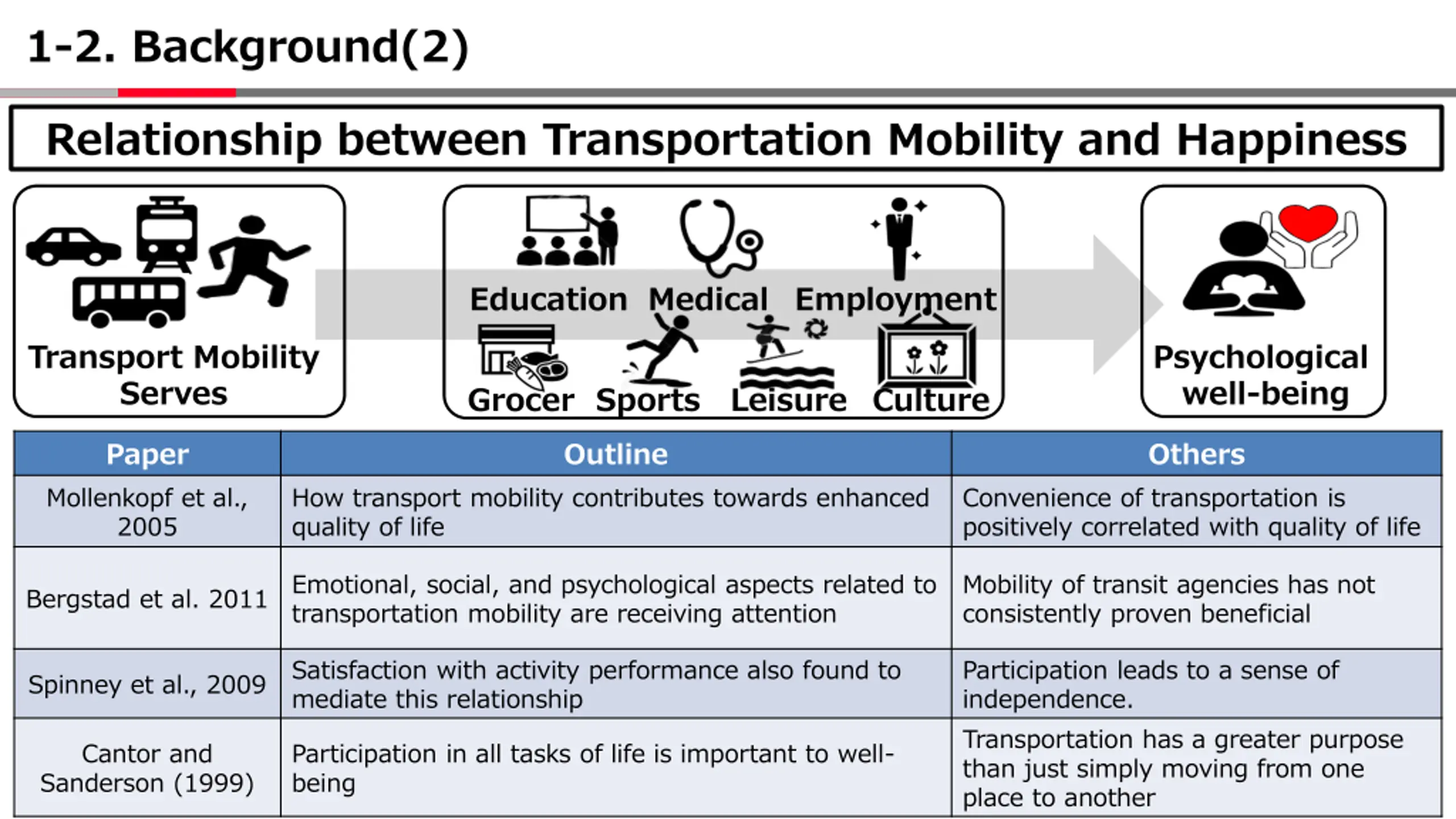 1-2. Background(2) Relationship between Transportation Mobility and Happiness Education Medical Employment Transport Mobility Serves Psychological well-being Grocer Sports Leisure Culture Paper Outline Others Mollenkopf et al., 2005 How transport mobility contributes towards enhanced quality of life Convenience of transportation is positively correlated with quality of life Bergstad et al. 2011 Emotional, social, and psychological aspects related to transportation mobility are receiving attention Mobility of transit agencies has not consistently proven beneficial Satisfaction with activity performance also found to mediate this relationship Participation leads to a sense of independence. Transportation has a greater purpose than just simply moving from one place to another Spinney et al., 2009 Cantor and Sanderson (1999) Participation in all tasks of life is important to well- being