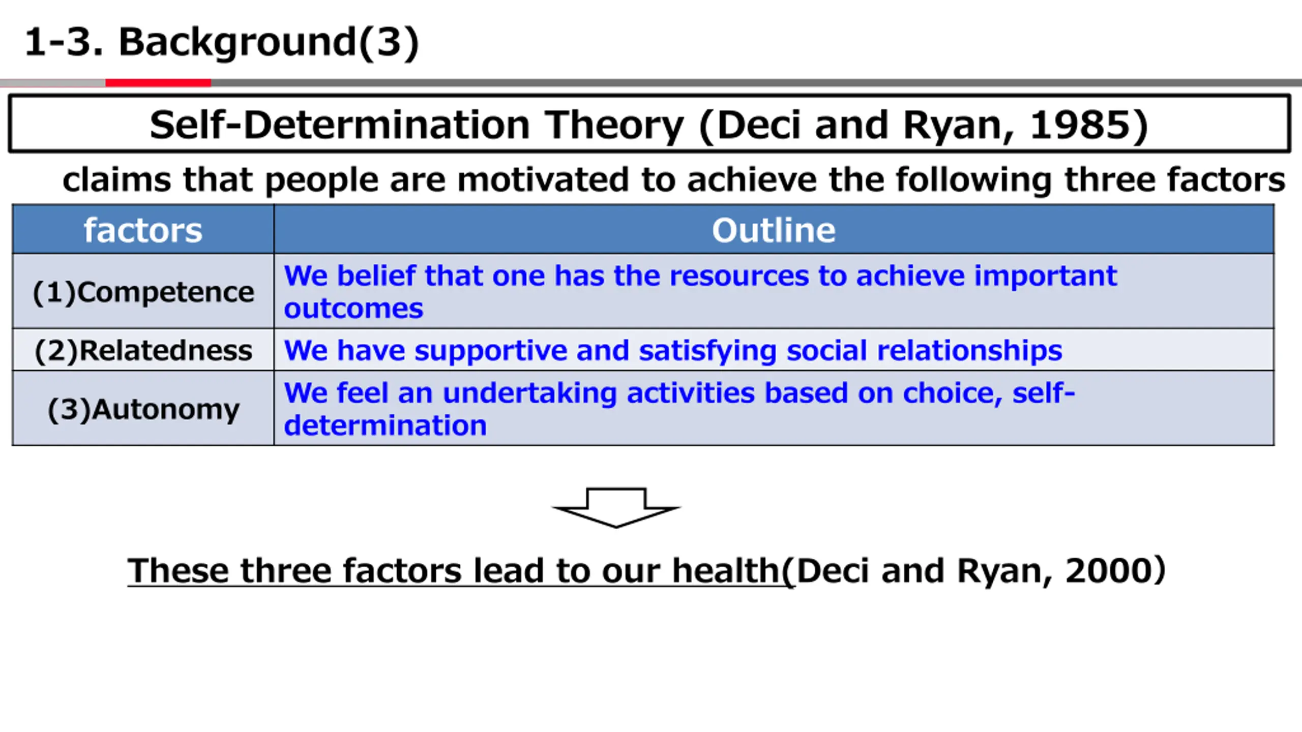 1-3. Background(3) Self-Determination Theory (Deci and Ryan, 1985) claims that people are motivated to achieve the following three factors factors We belief that one has the resources to achieve important outcomes (2)Relatedness We have supportive and satisfying social relationships We feel an undertaking activities based on choice, self- determination Outline (1)Competence (3)Autonomy These three factors lead to our health(Deci and Ryan, 2000