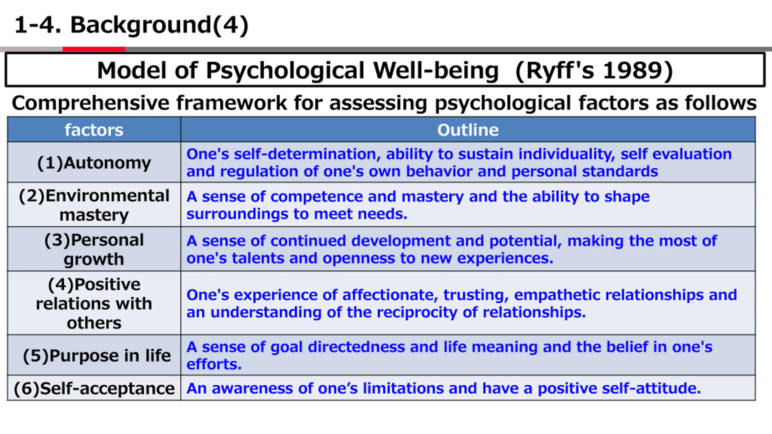 1-4. Background(4) Model of Psychological Well-being (Ryff's 1989) Comprehensive framework for assessing psychological factors as follows factors Outline One's self-determination, ability to sustain individuality, self evaluation and regulation of one's own behavior and personal standards A sense of competence and mastery and the ability to shape surroundings to meet needs. (1)Autonomy (2)Environmental mastery (3)Personal growth (4)Positive relations with others A sense of continued development and potential, making the most of one's talents and openness to new experiences. One's experience of affectionate, trusting, empathetic relationships and an understanding of the reciprocity of relationships. A sense of goal directedness and life meaning and the belief in one's efforts. (6)Self-acceptance An awareness of one s limitations and have a positive self-attitude. (5)Purpose in life