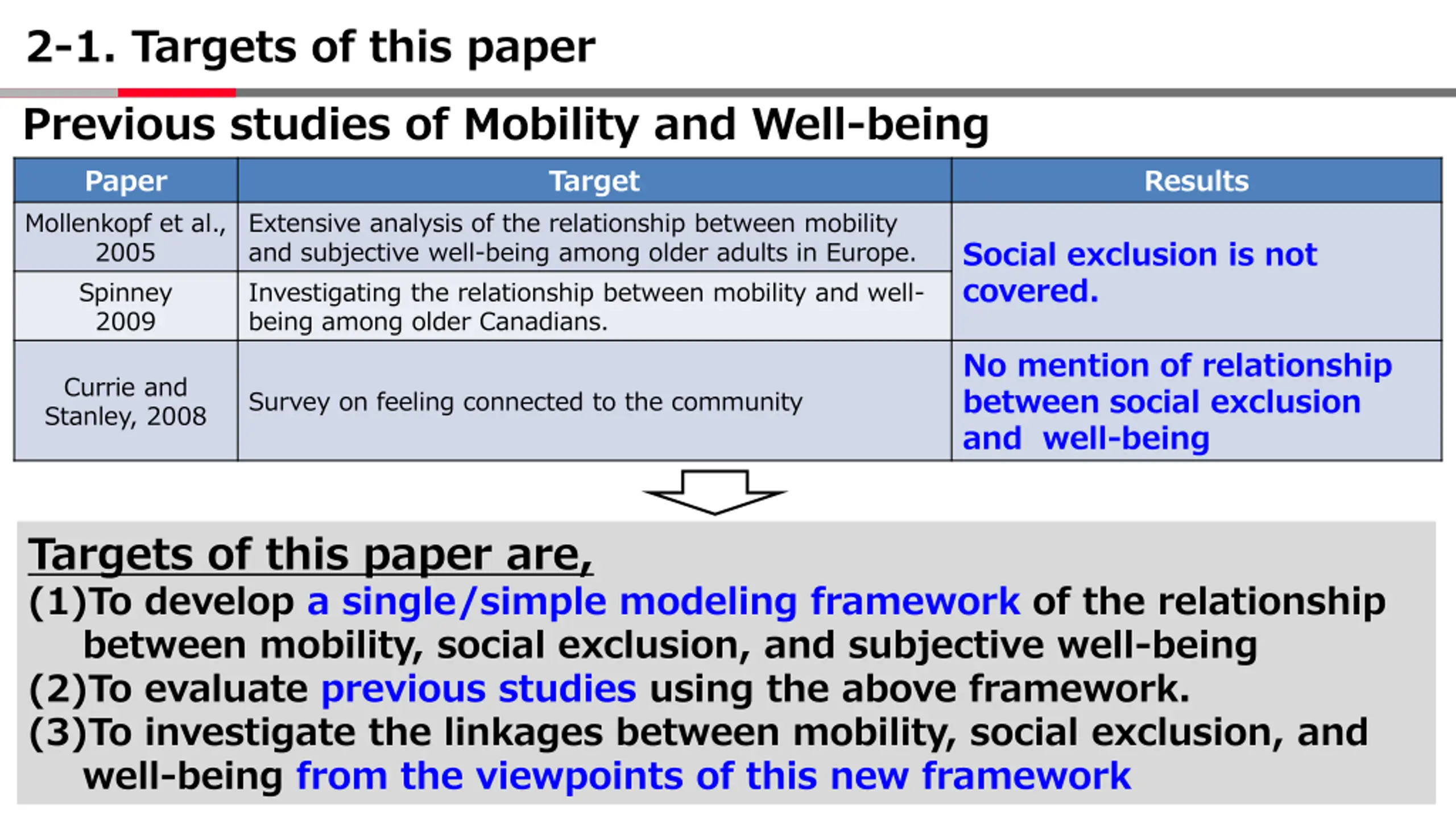 2-1. Targets of this paper Previous studies of Mobility and Well-being Paper Target Results Mollenkopf et al., 2005 Spinney 2009 Extensive analysis of the relationship between mobility and subjective well-being among older adults in Europe. Investigating the relationship between mobility and well- being among older Canadians. Social exclusion is not covered. No mention of relationship between social exclusion and well-being Currie and Stanley, 2008 Survey on feeling connected to the community Targets of this paper are, (1)To develop a single/simple modeling framework of the relationship between mobility, social exclusion, and subjective well-being (2)To evaluate previous studies using the above framework. (3)To investigate the linkages between mobility, social exclusion, and well-being from the viewpoints of this new framework