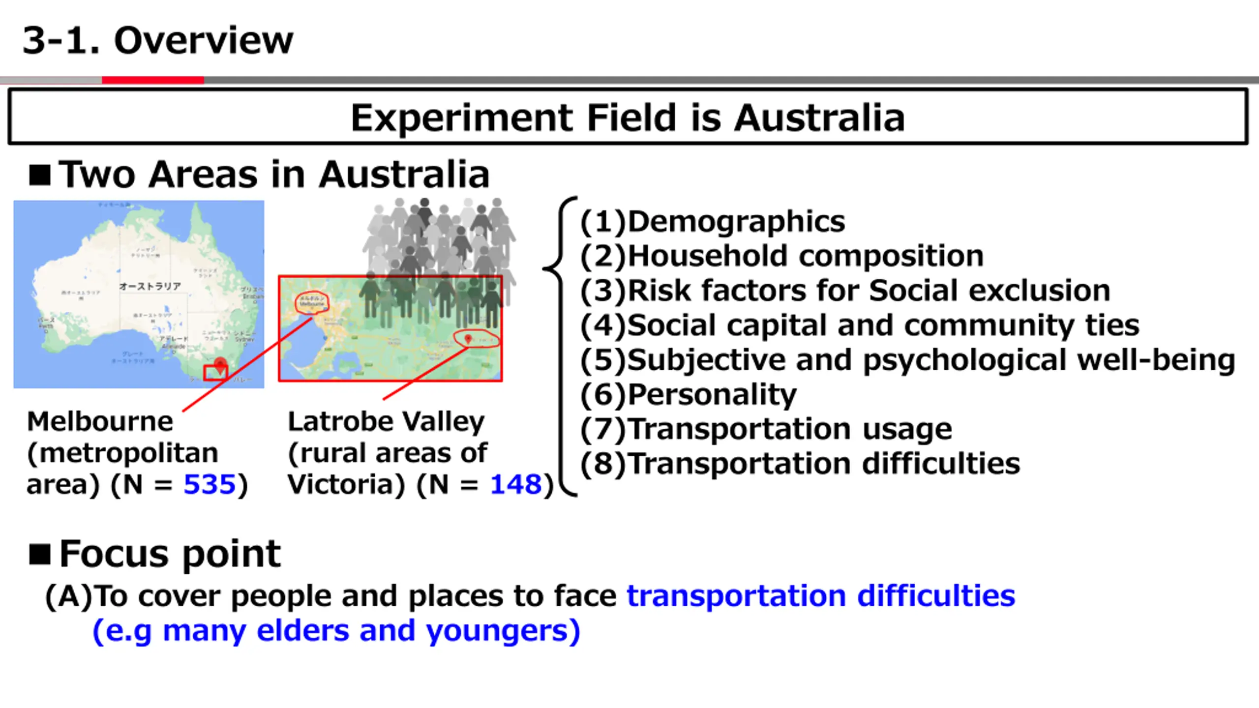3-1. Overview Experiment Field is Australia Two Areas in Australia (1)Demographics (2)Household composition (3)Risk factors for Social exclusion (4)Social capital and community ties (5)Subjective and psychological well-being (6)Personality (7)Transportation usage (8)Transportation difficulties Melbourne (metropolitan area) (N = 535) Latrobe Valley (rural areas of Victoria) (N = 148) Focus point (A)To cover people and places to face transportation difficulties (e.g many elders and youngers)