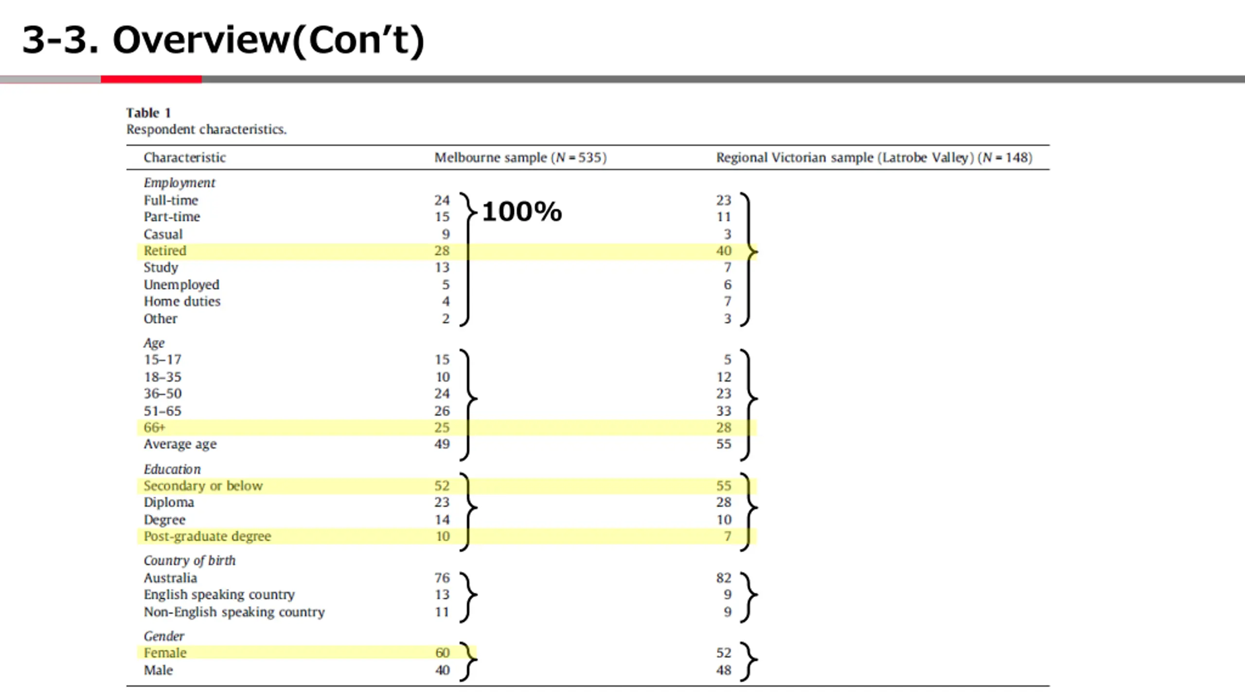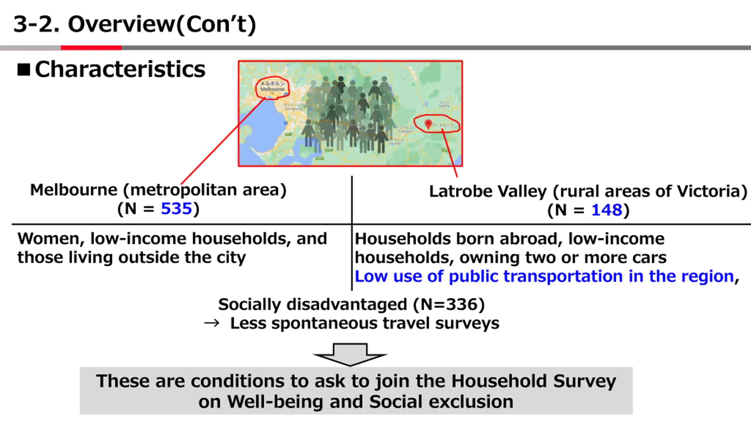 3-2. Overview(Cont) Characteristics Melbourne (metropolitan area) (N = 535) Latrobe Valley (rural areas of Victoria) (N = 148) Women, low-income households, and those living outside the city Households born abroad, low-income households, owning two or more cars Low use of public transportation in the region, Socially disadvantaged (N=336) Less spontaneous travel surveys These are conditions to ask to join the Household Survey on Well-being and Social exclusion