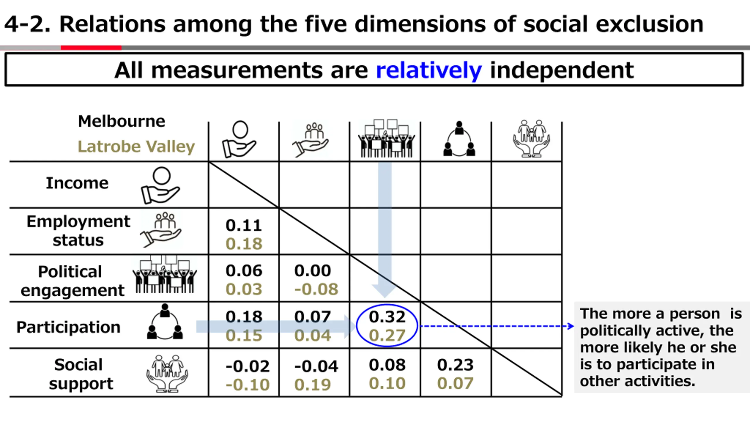 4-2. Relations among the five dimensions of social exclusion All measurements are relatively independent Melbourne Latrobe Valley Income Employment status 0.11 0.18 0.06 0.03 0.00 -0.08 Political engagement The more a person is politically active, the more likely he or she is to participate in other activities. 0.18 0.15 0.07 0.04 0.32 0.27 Participation Social support 0.08 0.10 0.23 0.07 -0.02 -0.10 -0.04 0.19