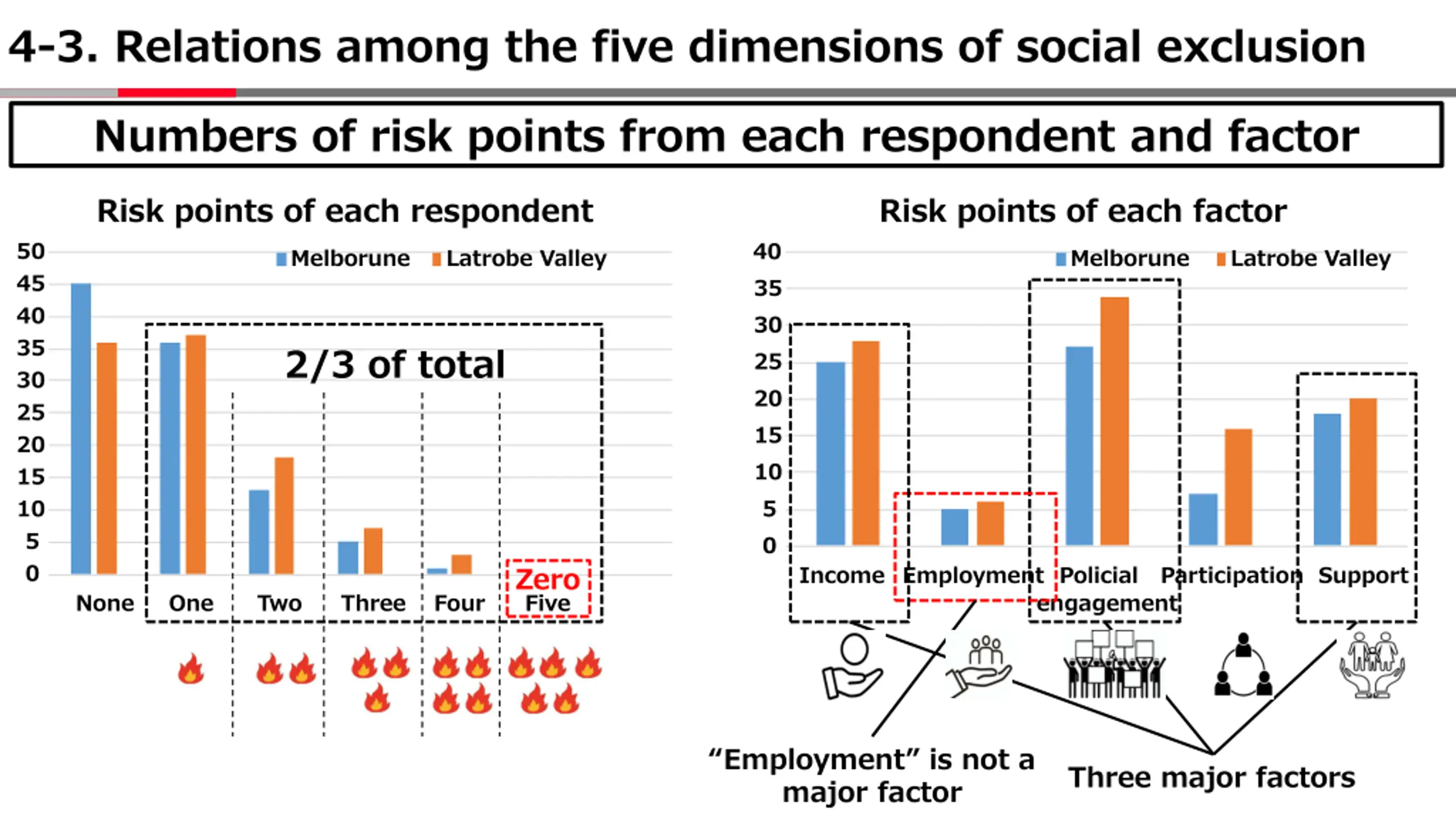 4-3. Relations among the five dimensions of social exclusion Numbers of risk points from each respondent and factor Risk points of each respondent Risk points of each factor 50 40 Melborune Latrobe Valley Melborune Latrobe Valley 45 35 40 30 35 2/3 of total 25 30 20 25 15 20 10 15 5 10 5 0 0 Zero Income Employment Policial Participation Support None One Two Three Four Five engagement Employment is not a major factor Three major factors