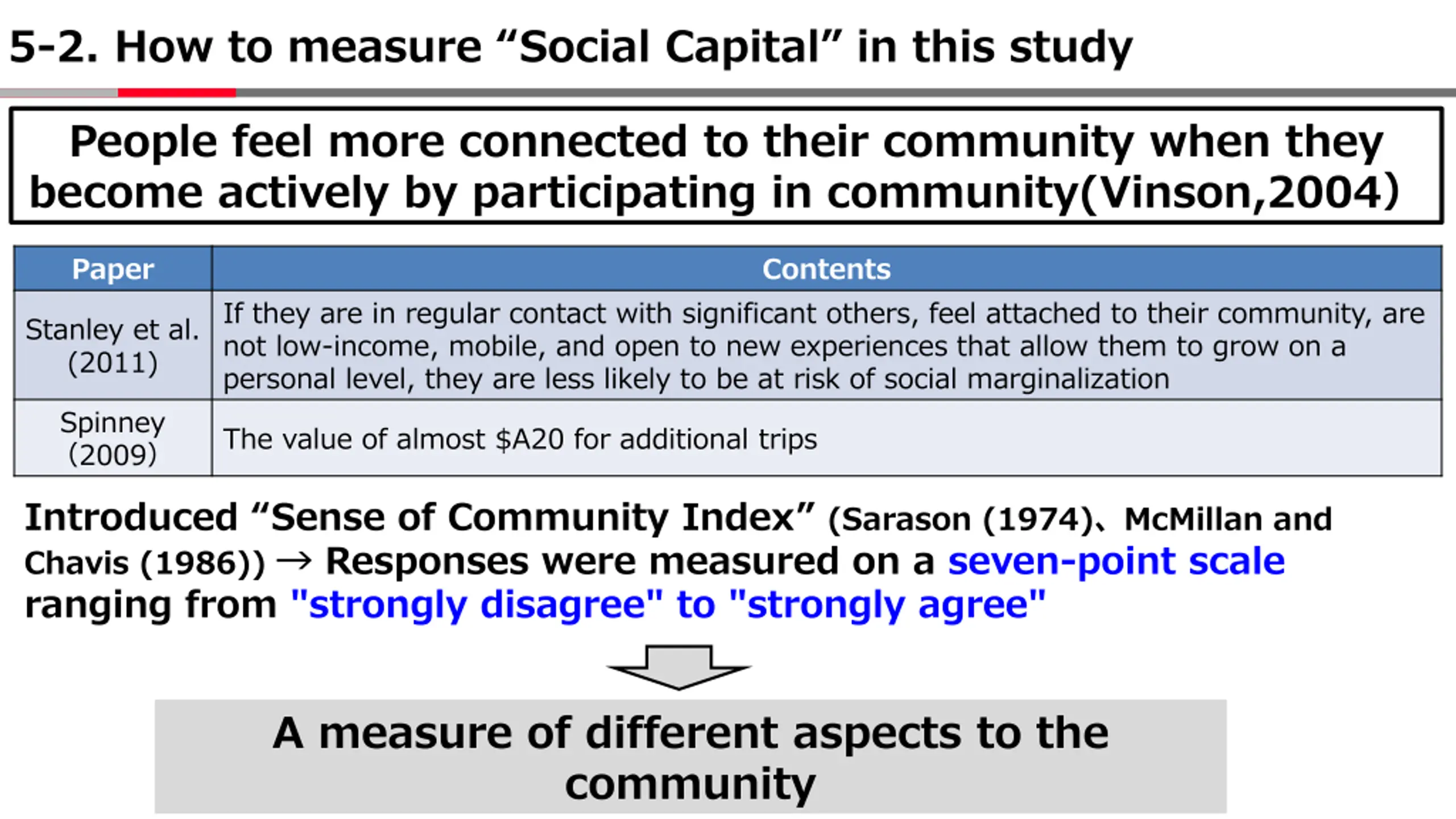 5-2. How to measure Social Capital in this study People feel more connected to their community when they become actively by participating in community(Vinson,2004 Paper Contents If they are in regular contact with significant others, feel attached to their community, are not low-income, mobile, and open to new experiences that allow them to grow on a personal level, they are less likely to be at risk of social marginalization Stanley et al. (2011) Spinney 2009 The value of almost $A20 for additional trips Introduced Sense of Community Index (Sarason (1974) McMillan and Chavis (1986)) Responses were measured on a seven-point scale ranging from "strongly disagree" to "strongly agree" A measure of different aspects to the community