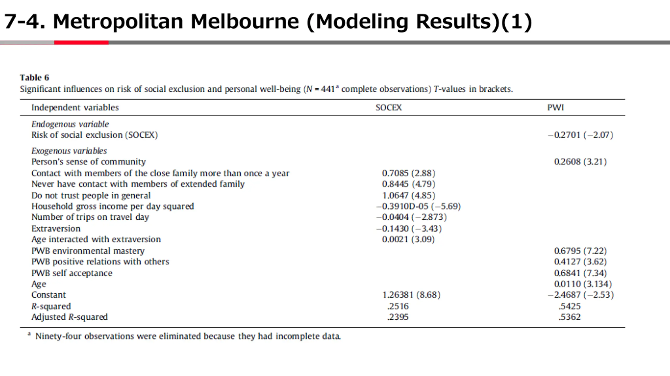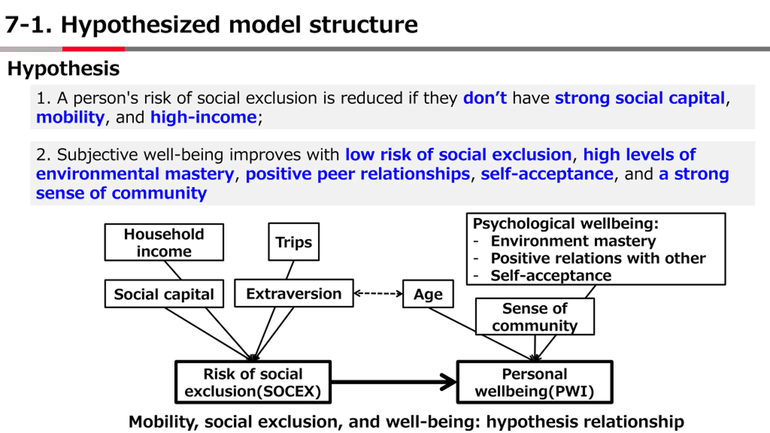 7-1. Hypothesized model structure Hypothesis 1. A person's risk of social exclusion is reduced if they don t have strong social capital, mobility, and high-income; 2. Subjective well-being improves with low risk of social exclusion, high levels of environmental mastery, positive peer relationships, self-acceptance, and a strong sense of community Psychological wellbeing: - Environment mastery - Positive relations with other - Self-acceptance Household income Trips Extraversion Social capital Age Sense of community Risk of social exclusion(SOCEX) Personal wellbeing(PWI) Mobility, social exclusion, and well-being: hypothesis relationship