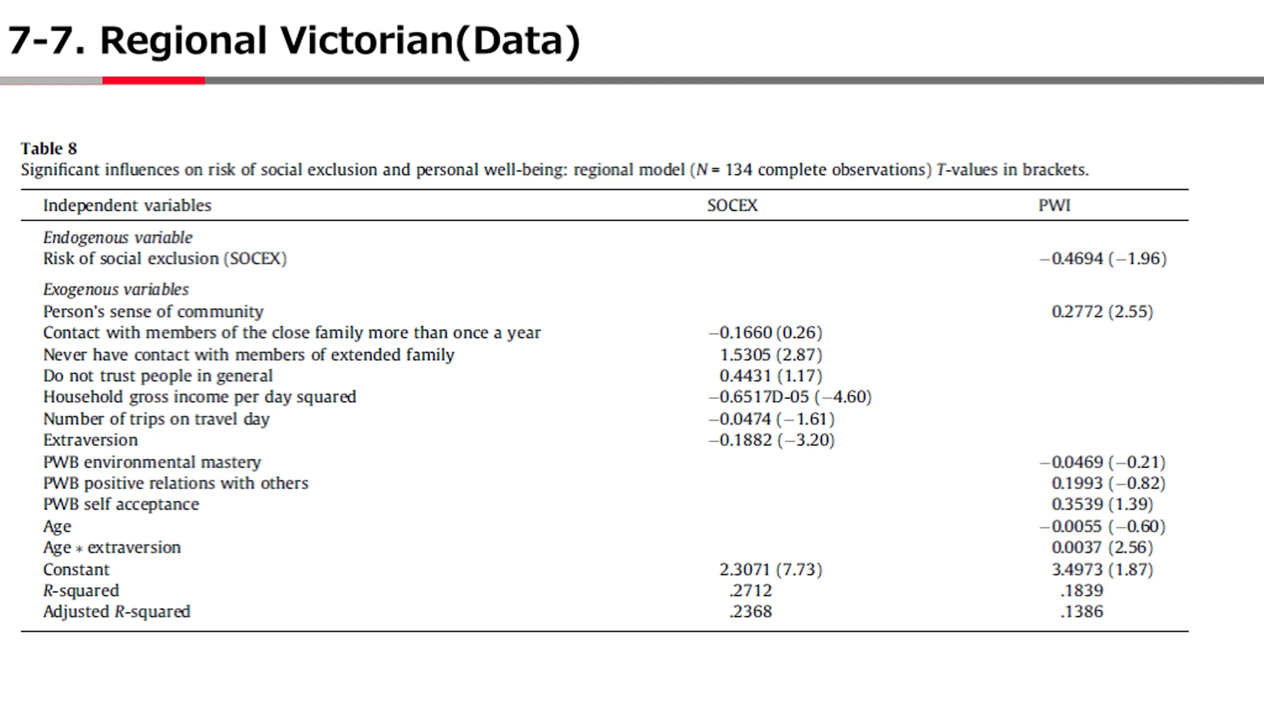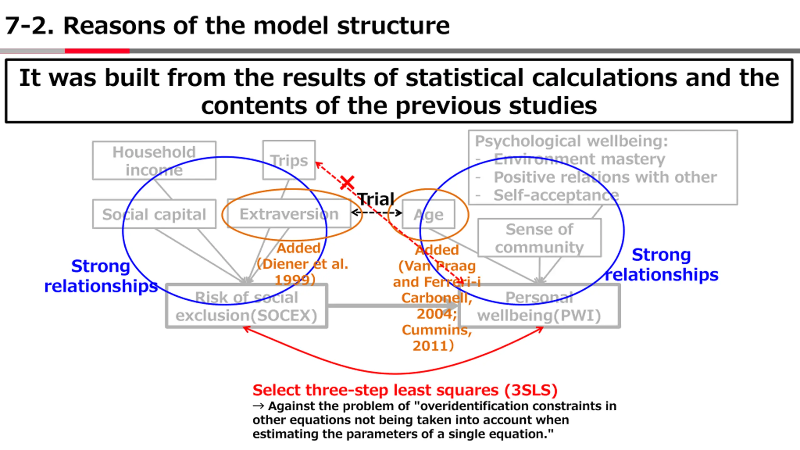 7-2. Reasons of the model structure It was built from the results of statistical calculations and the contents of the previous studies Psychological wellbeing: - Environment mastery - Positive relations with other - Self-acceptance Household income Trips Trial Extraversion Social capital Age Sense of community Added Added (Van Praag and Ferreri-i Carbonell, 2004; Cummins, 2011 Strong relationships Strong relationships Diener et al. 1999 Risk of social exclusion(SOCEX) Personal wellbeing(PWI) Select three-step least squares (3SLS) Against the problem of "overidentification constraints in other equations not being taken into account when estimating the parameters of a single equation."