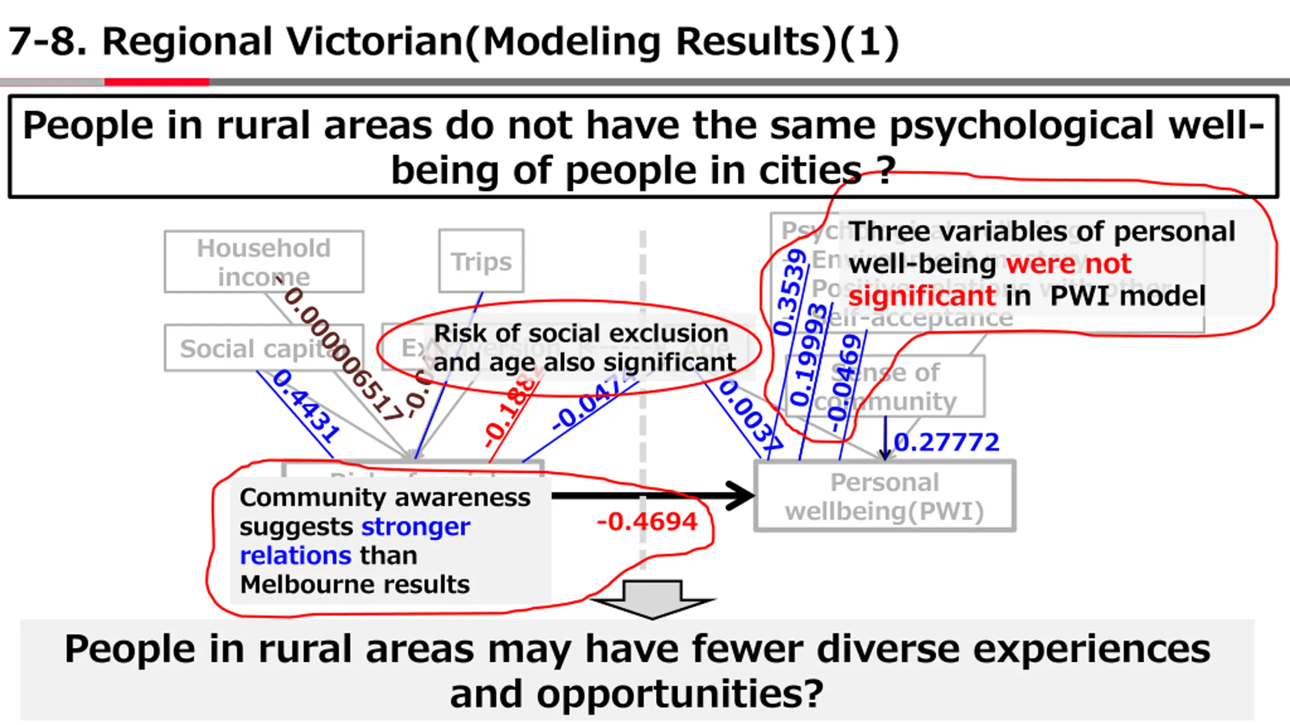 7-8. Regional Victorian(Modeling Results)(1) People in rural areas do not have the same psychological well- being of people in cities ? Three variables of personal well-being were not significant in PWI model Psychological wellbeing: - Environment mastery - Positive relations with other - Self-acceptance Household income Trips Risk of social exclusion Extraversion and age also significant Social capital Age Sense of community 0.27772 Risk of social exclusion(SOCEX) suggests stronger relations than Melbourne results Personal wellbeing(PWI) Community awareness -0.4694 People in rural areas may have fewer diverse experiences and opportunities?