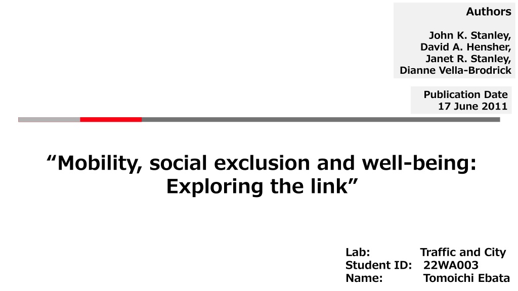 Authors John K. Stanley, David A. Hensher, Janet R. Stanley, Dianne Vella-Brodrick Publication Date 17 June 2011 Mobility, social exclusion and well-being: Exploring the link Lab: Student ID: 22WA003 Name: Traffic and City Tomoichi Ebata