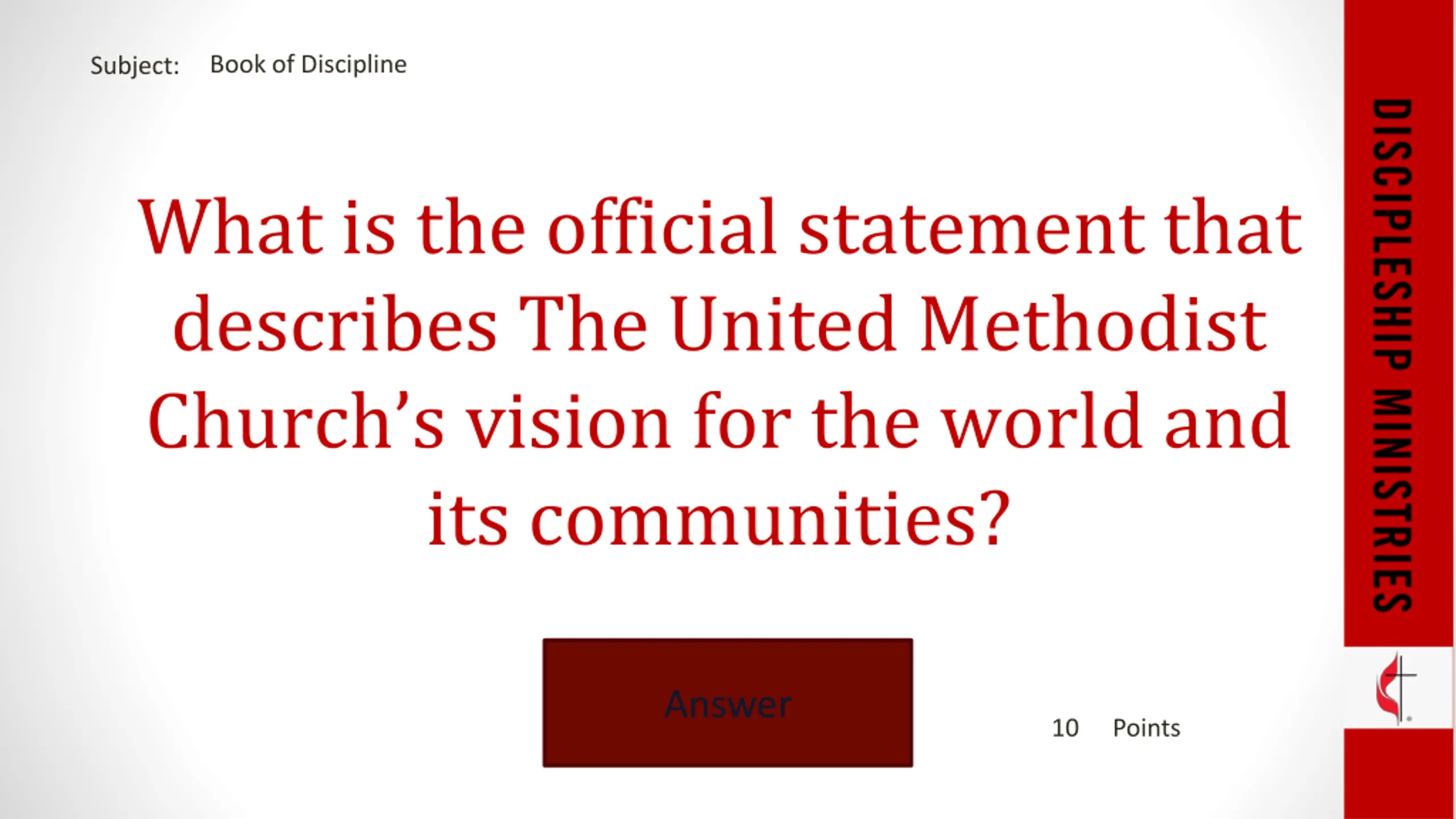 Book of Discipline Subject: What is the official statement that describes The United Methodist Church s vision for the world and its communities? Answer Answer 10 Points
