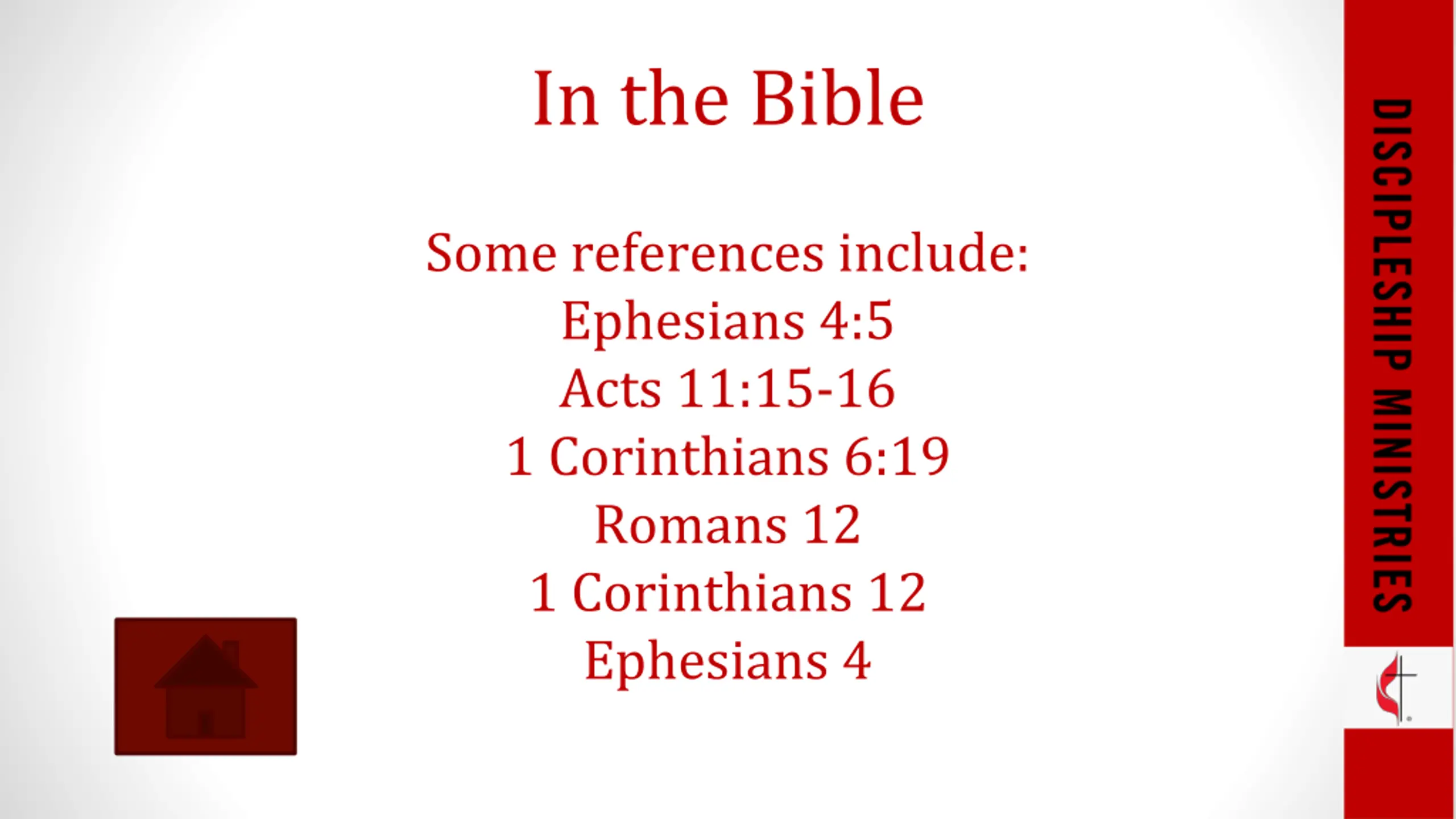 In the Bible Some references include: Ephesians 4:5 Acts 11:15-16 1 Corinthians 6:19 Romans 12 1 Corinthians 12 Ephesians 4