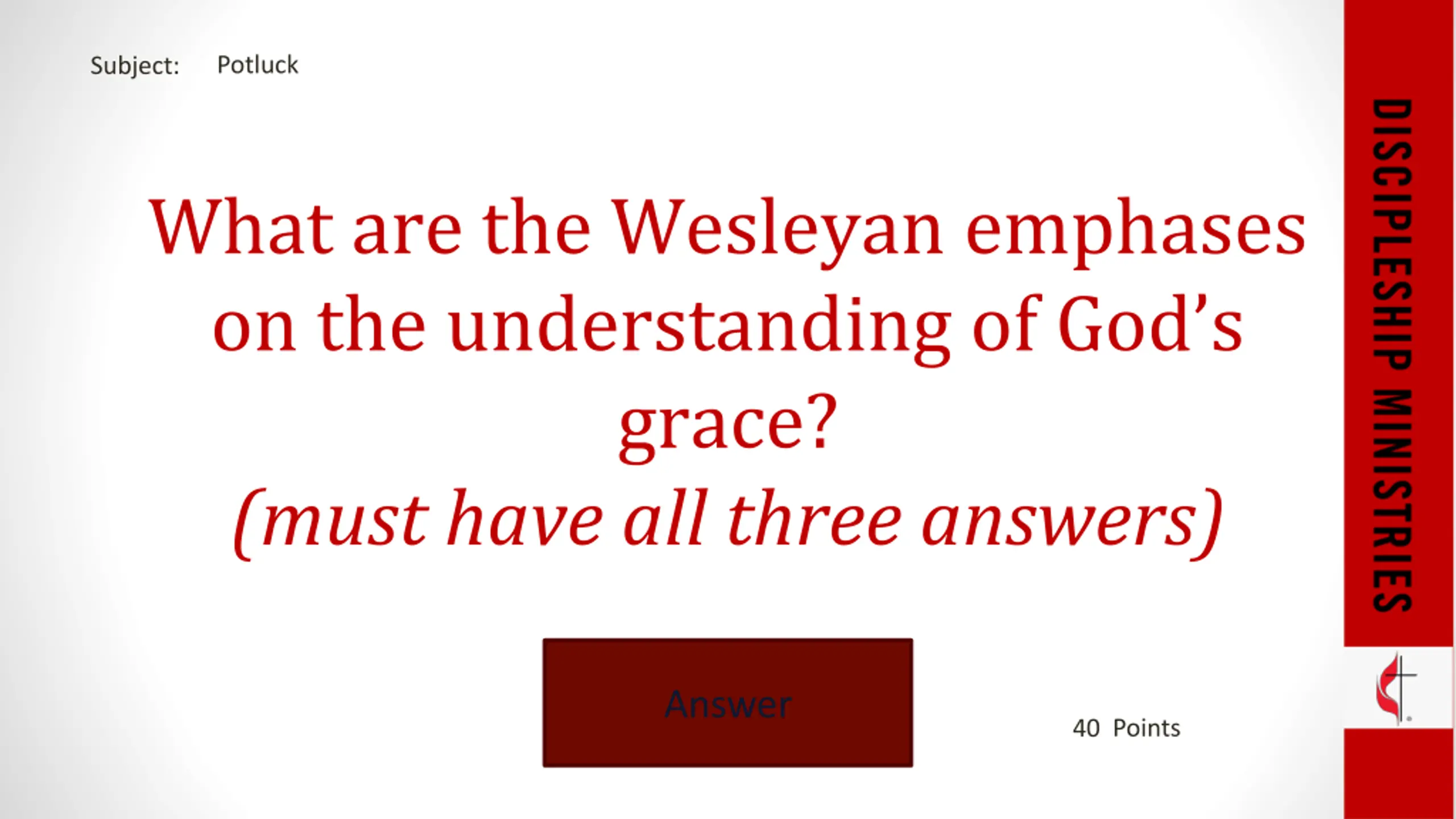Potluck Subject: What are the Wesleyan emphases on the understanding of God s grace? (must have all three answers) Answer Answer Points 40
