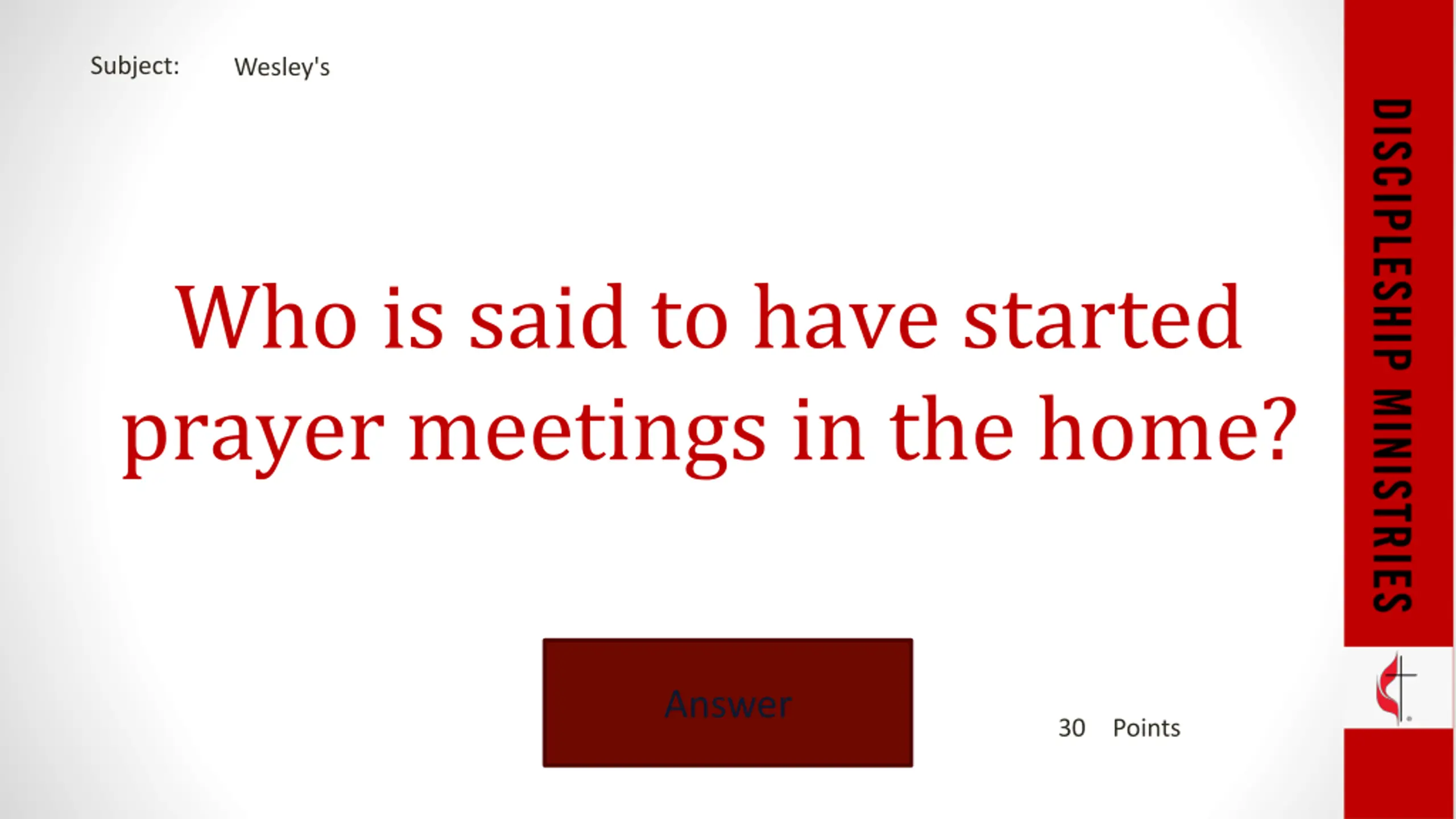 Subject: Wesley's Who is said to have started prayer meetings in the home? Answer Answer 30 Points