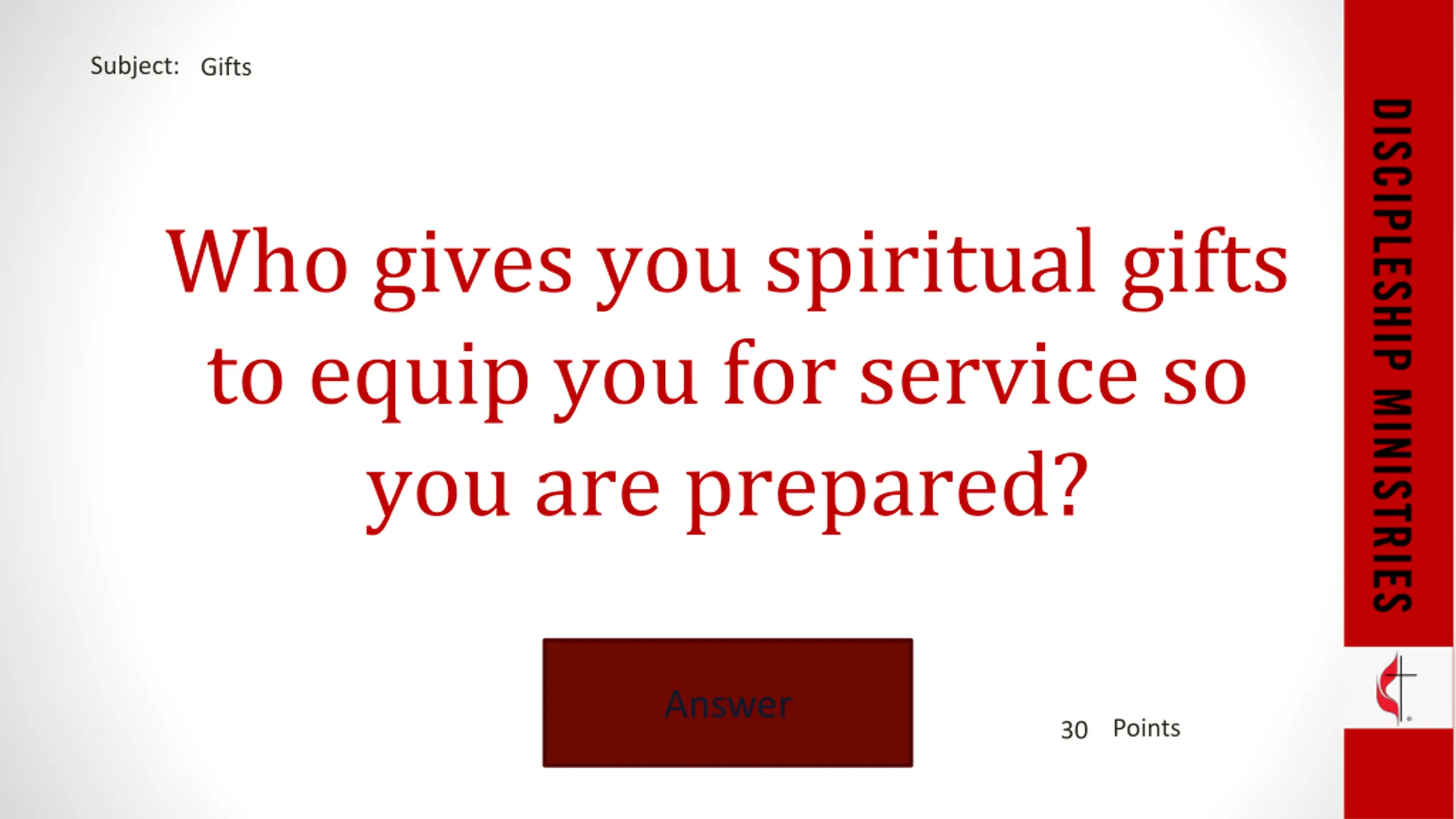 Subject: Gifts Who gives you spiritual gifts to equip you for service so you are prepared? Answer Answer Points 30