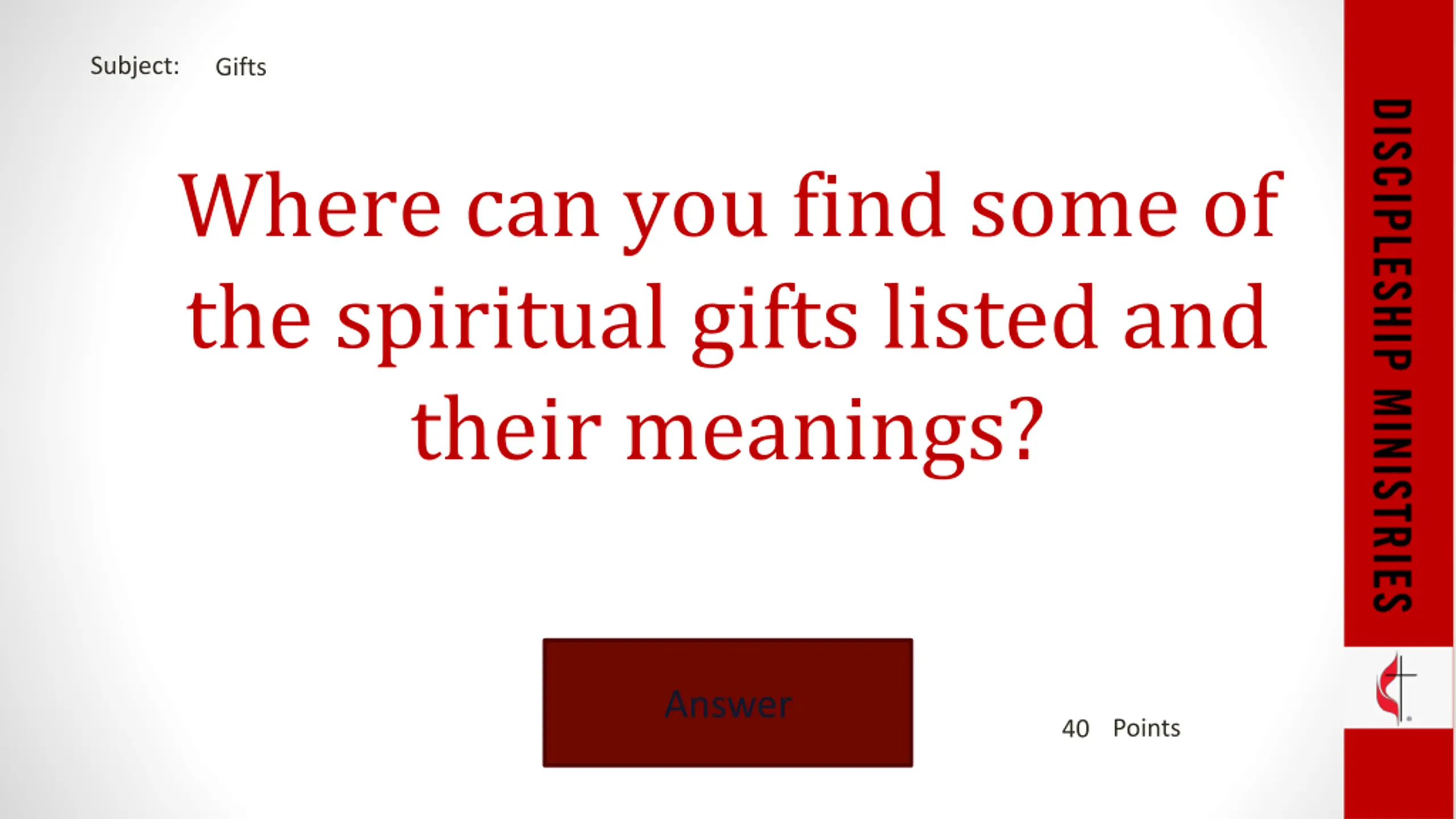 Subject: Gifts Where can you find some of the spiritual gifts listed and their meanings? Answer Answer Points 40