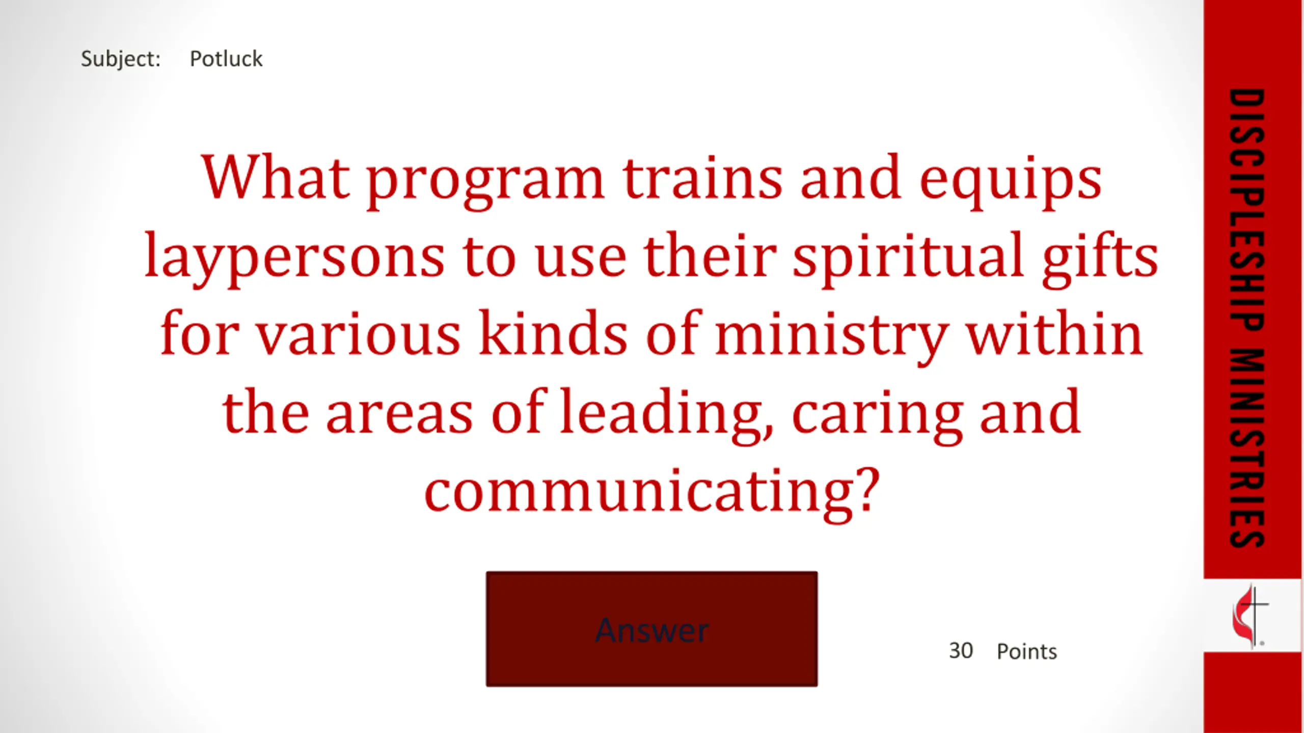 Subject: Potluck What program trains and equips laypersons to use their spiritual gifts for various kinds of ministry within the areas of leading, caring and communicating? Answer Answer 30 Points