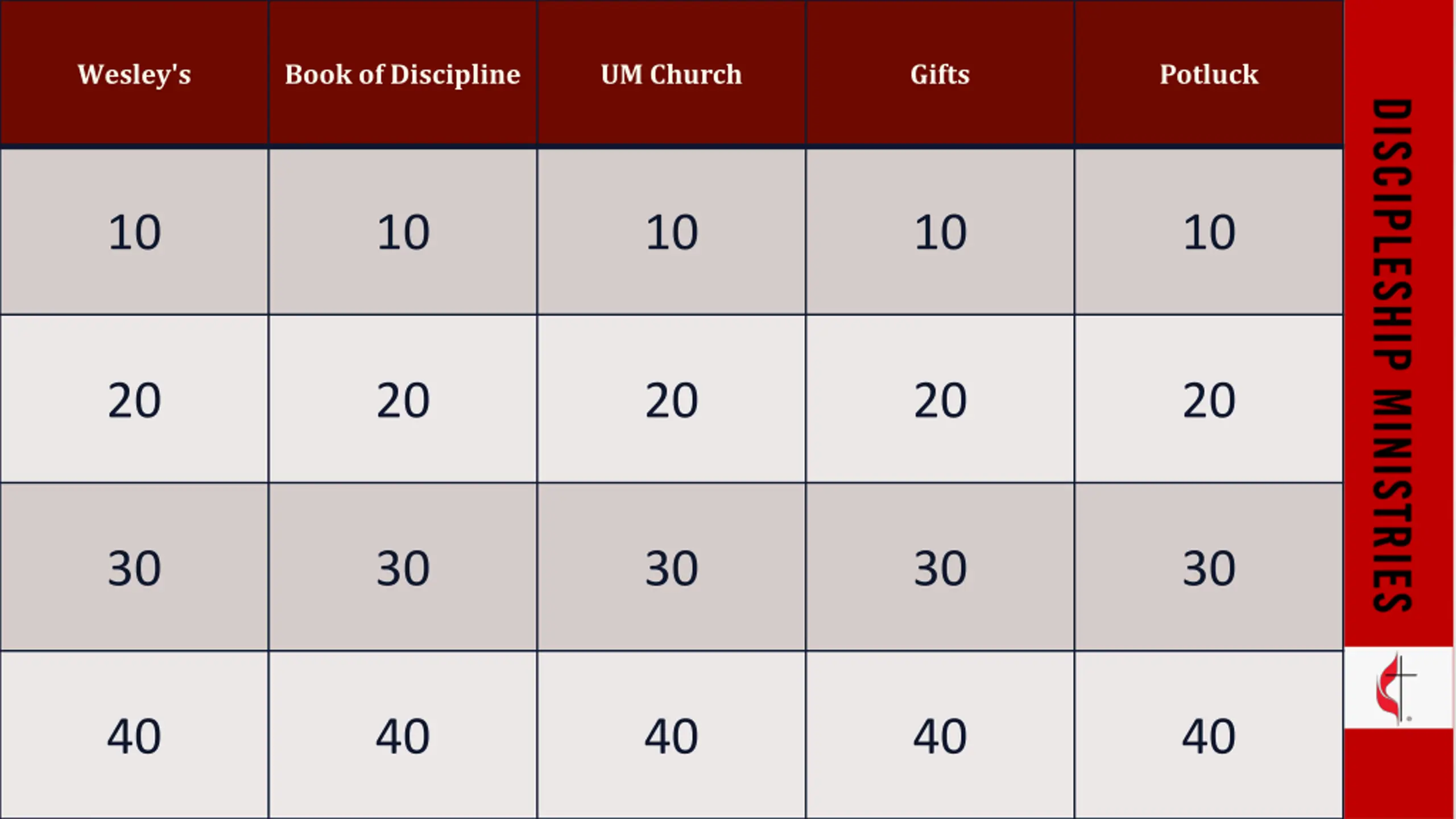 Subject: Wesley's Book of Discipline UM Church Gifts Potluck 10 10 10 10 10 20 20 20 20 20 30 30 30 30 30 Answer Answer 40 40 40 40 40 Points