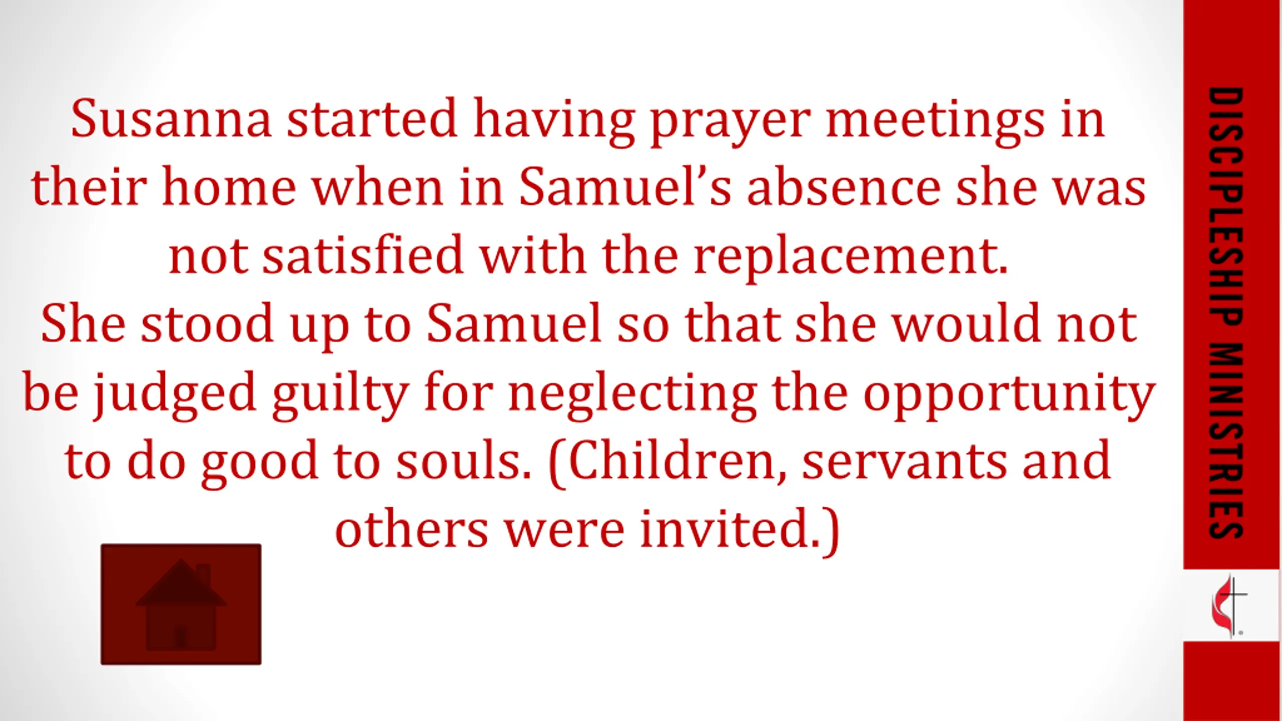 Susanna started having prayer meetings in their home when in Samuel s absence she was not satisfied with the replacement. She stood up to Samuel so that she would not be judged guilty for neglecting the opportunity to do good to souls. (Children, servants and others were invited.)