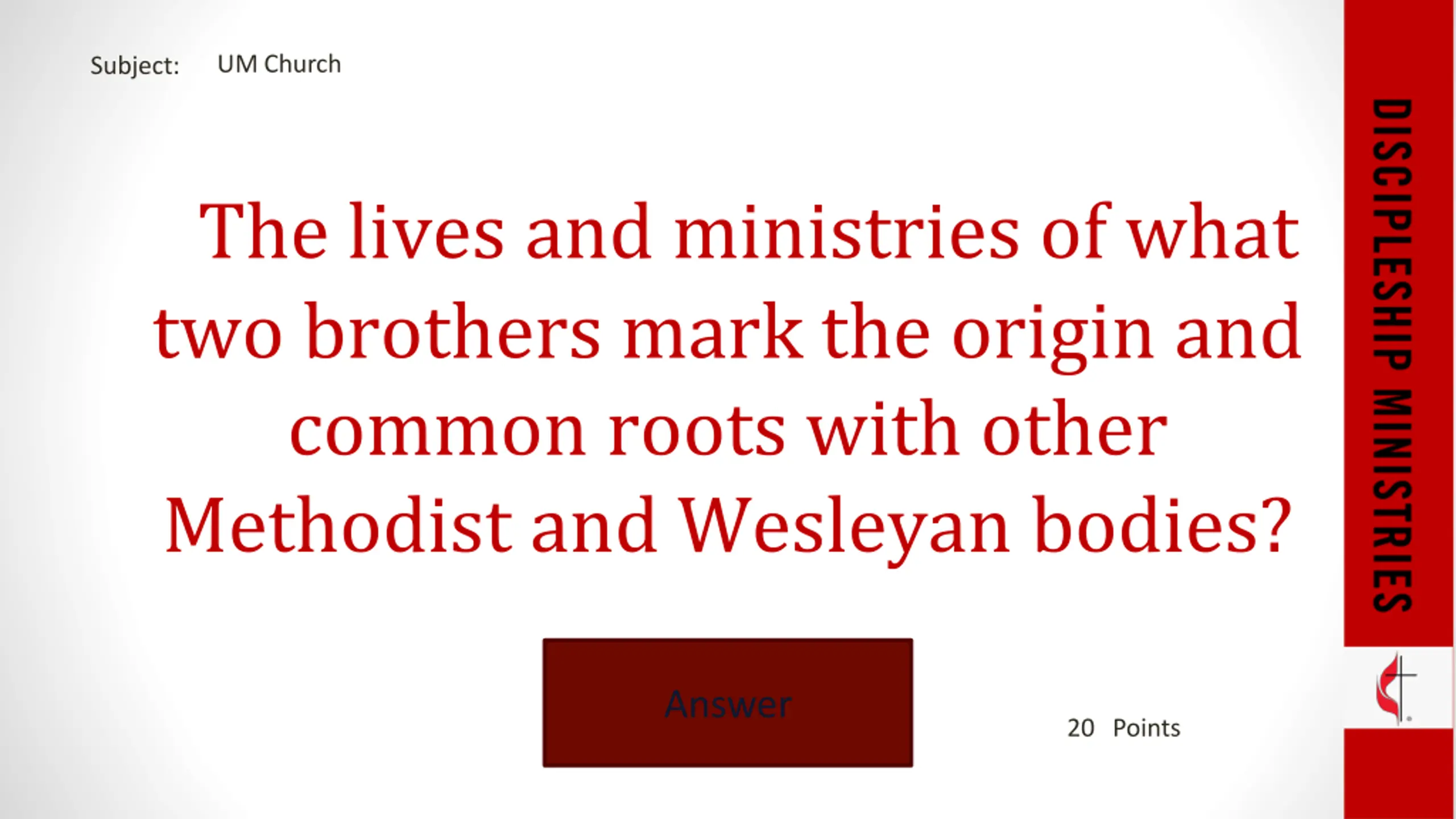 UM Church Subject: The lives and ministries of what two brothers mark the origin and common roots with other Methodist and Wesleyan bodies? Answer Answer 20 Points