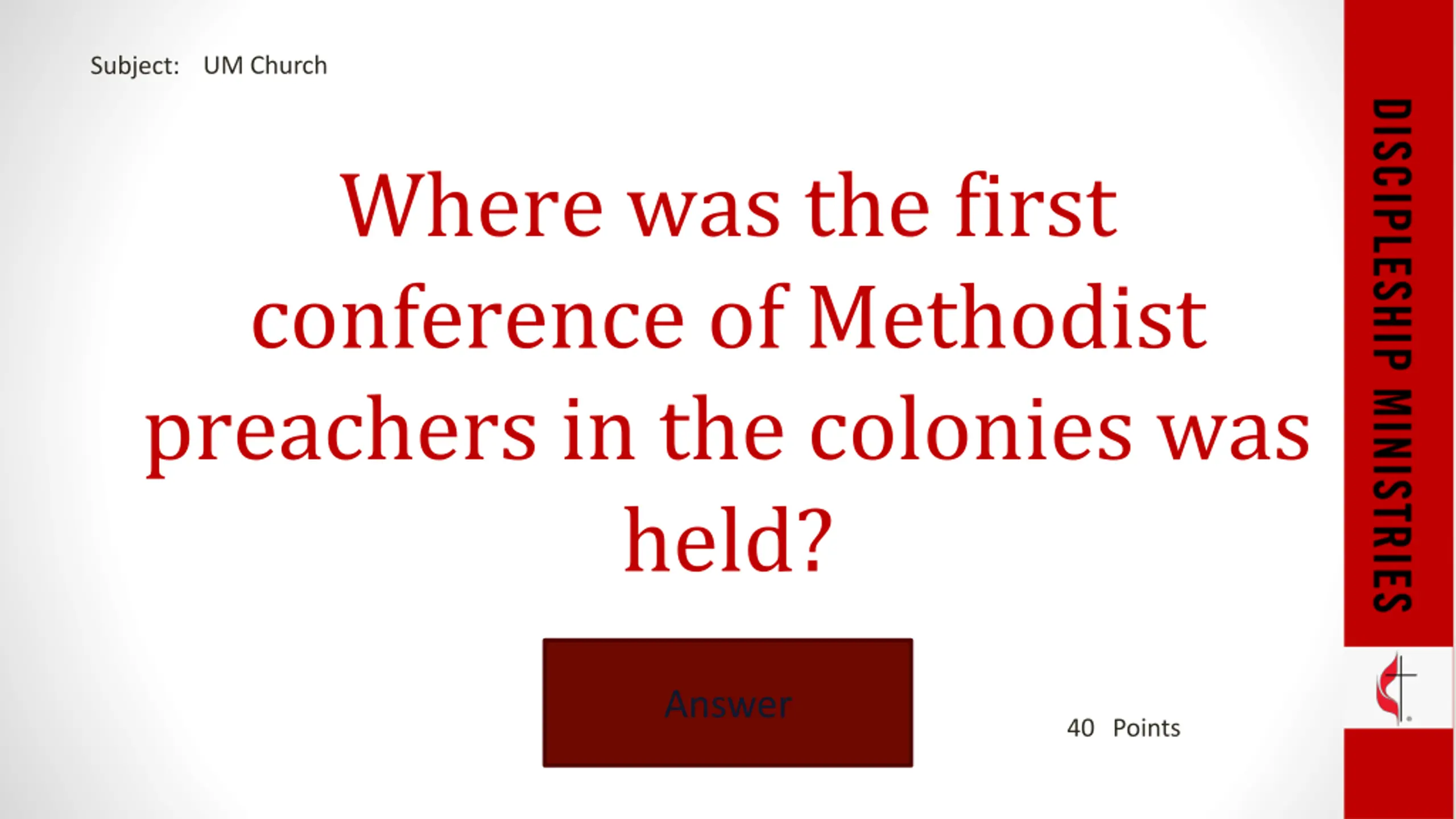 UM Church Subject: Where was the first conference of Methodist preachers in the colonies was held? Answer Answer 40 Points
