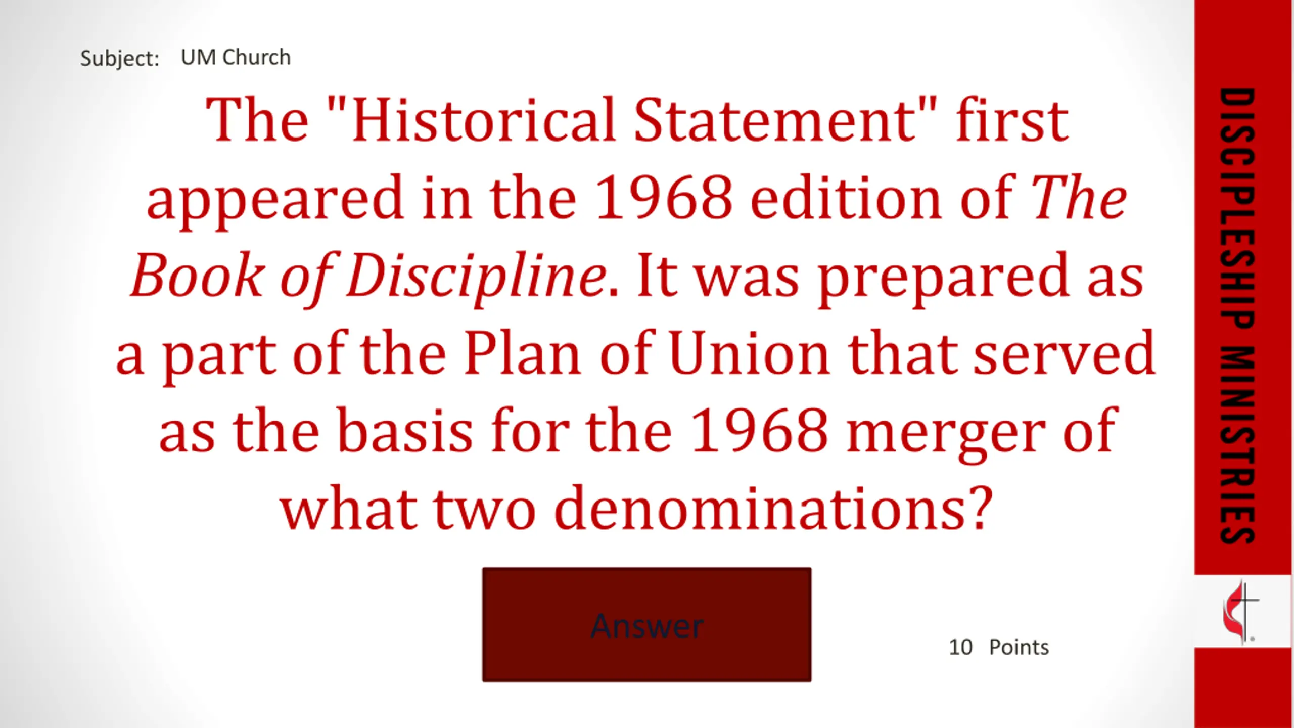 UM Church Subject: The "Historical Statement" first appeared in the 1968 edition of The Book of Discipline. It was prepared as a part of the Plan of Union that served as the basis for the 1968 merger of what two denominations? Answer Answer 10 Points