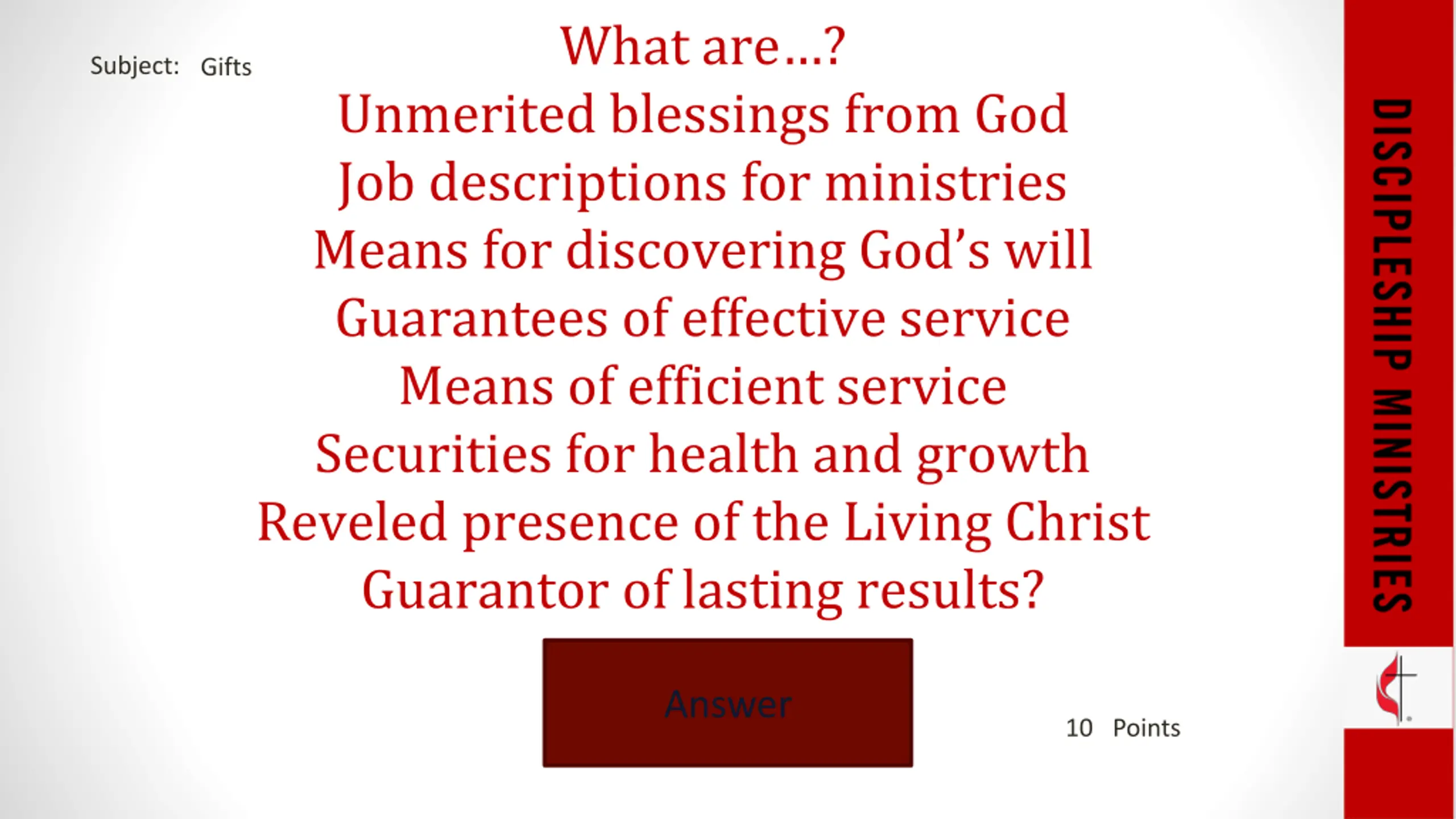 What are? Subject: Gifts Unmerited blessings from God Job descriptions for ministries Means for discovering God s will Guarantees of effective service Means of efficient service Securities for health and growth Reveled presence of the Living Christ Guarantor of lasting results? Answer Answer 10 Points