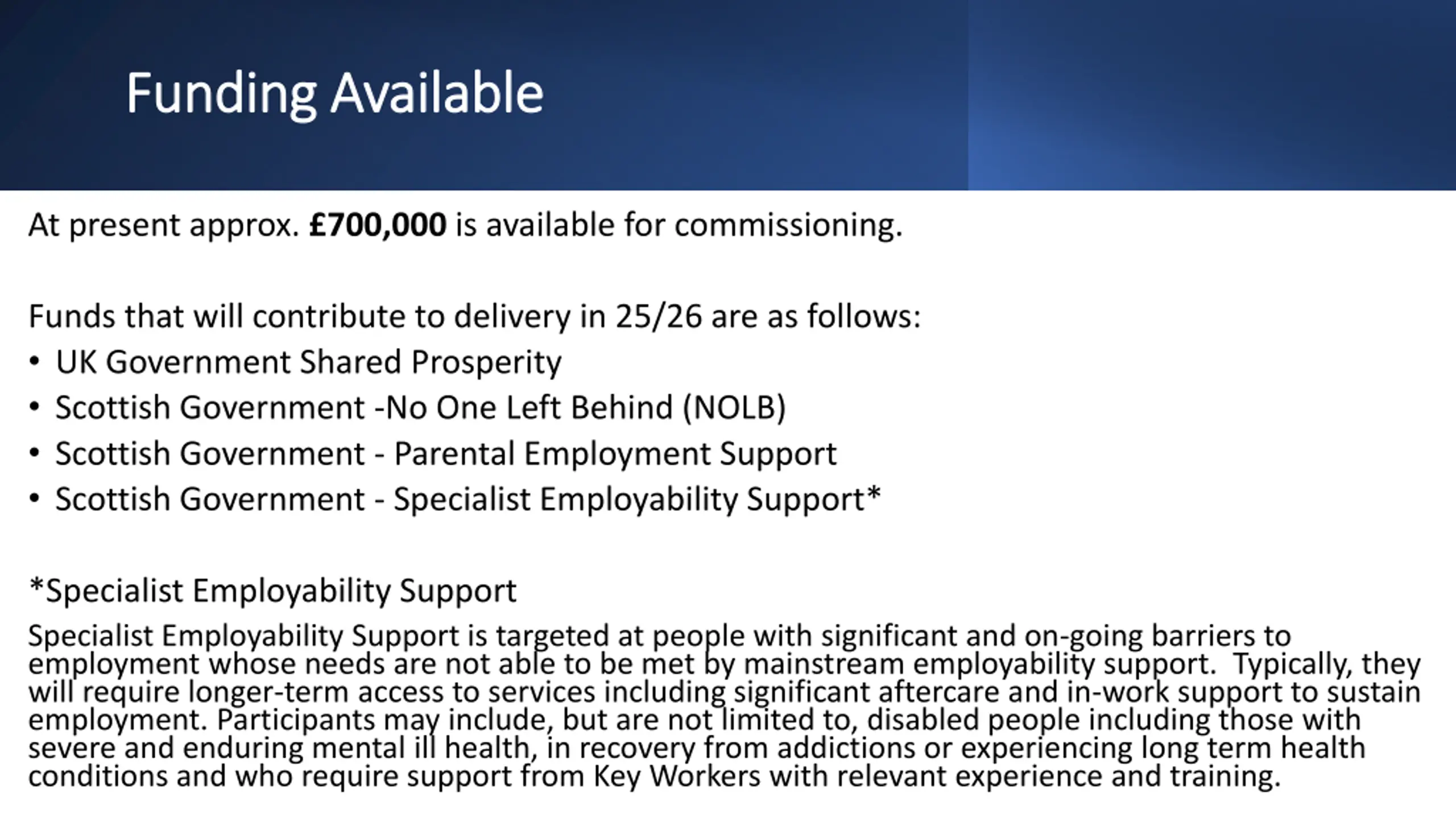 Funding Available Funding Available At present approx. 700,000 is available for commissioning. Funds that will contribute to delivery in 25/26 are as follows: UK Government Shared Prosperity Scottish Government -No One Left Behind (NOLB) Scottish Government - Parental Employment Support Scottish Government - Specialist Employability Support* *Specialist Employability Support Specialist Employability Support is targeted at people with significant and on-going barriers to employment whose needs are not able to be met by mainstream employability support. Typically, they will require longer-term access to services including significant aftercare and in-work support to sustain employment. Participants may include, but are not limited to, disabled people including those with severe and enduring mental ill health, in recovery from addictions or experiencing long term health conditions and who require support from Key Workers with relevant experience and training.