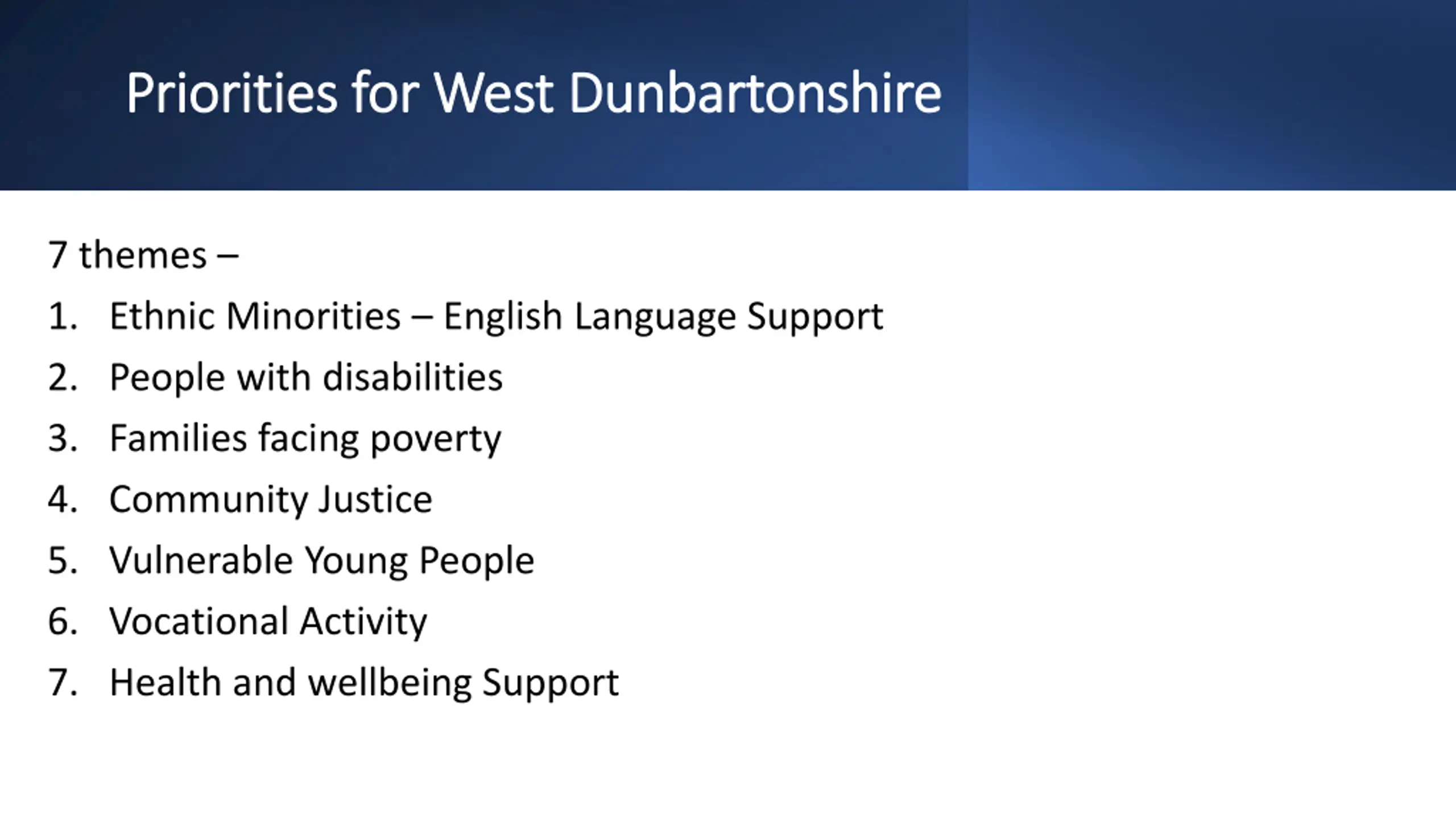 Priorities for West Dunbartonshire Priorities for West Dunbartonshire 7 themes 1. Ethnic Minorities English Language Support 2. People with disabilities 3. Families facing poverty 4. Community Justice 5. Vulnerable Young People 6. Vocational Activity 7. Health and wellbeing Support