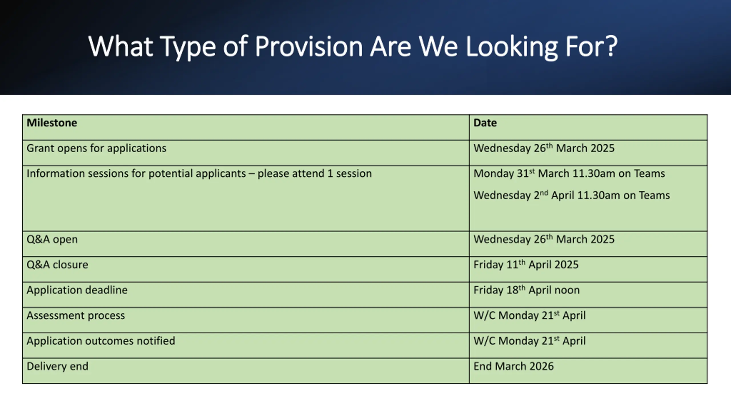 What Type of Provision Are We Looking For? What Type of Provision Are We Looking For? Milestone Date Wednesday 26thMarch 2025 Grant opens for applications Monday 31stMarch 11.30am on Teams Information sessions for potential applicants please attend 1 session Wednesday 2ndApril 11.30am on Teams Wednesday 26thMarch 2025 Q&A open Friday 11thApril 2025 Q&A closure Friday 18thApril noon Application deadline W/C Monday 21stApril Assessment process W/C Monday 21stApril Application outcomes notified Delivery end End March 2026