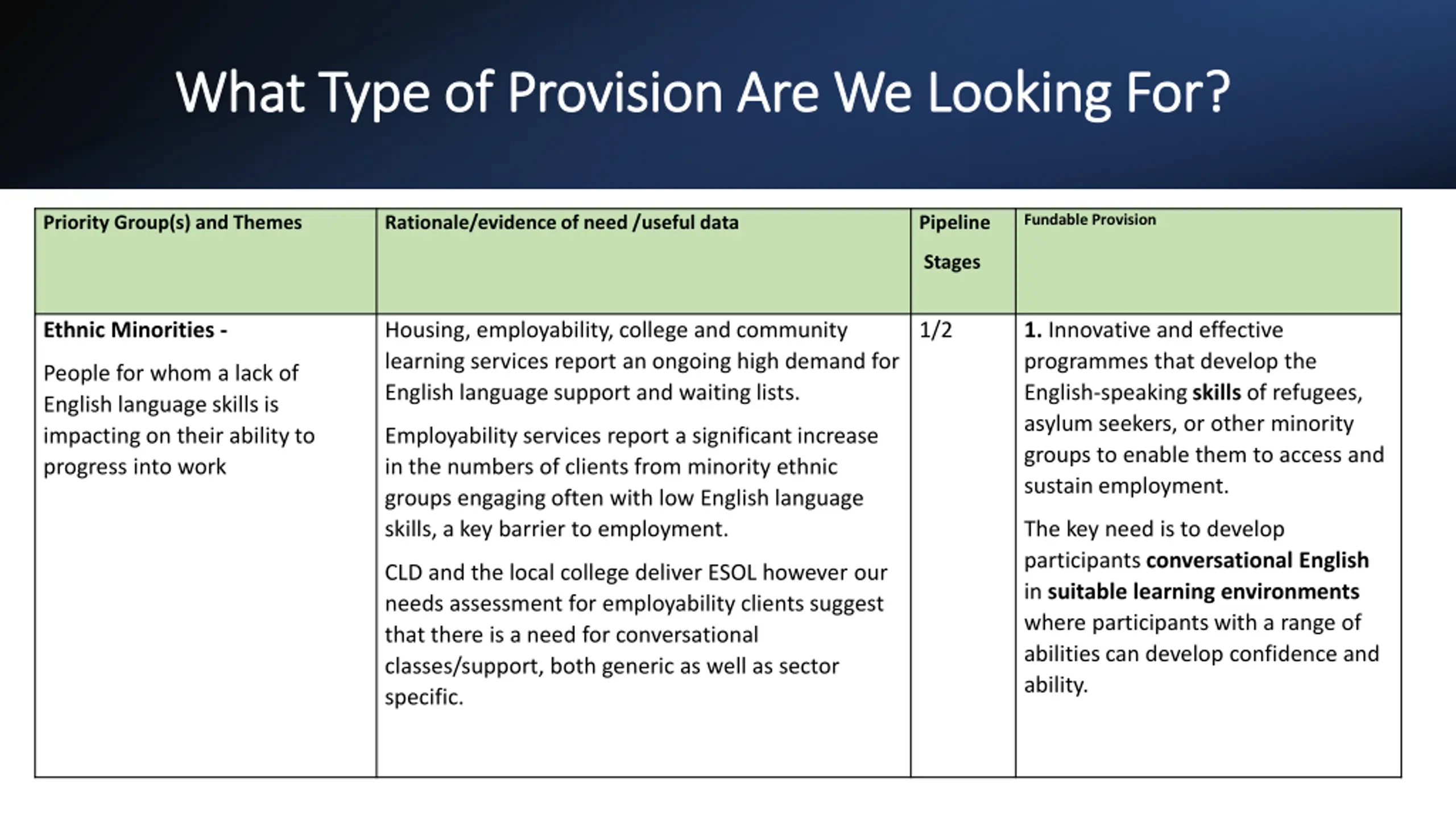 What Type of Provision Are We Looking For? What Type of Provision Are We Looking For? Fundable Provision Priority Group(s) and Themes Rationale/evidence of need /useful data Pipeline Stages Ethnic Minorities - Housing, employability, college and community learning services report an ongoing high demand for English language support and waiting lists. 1/2 1. Innovative and effective programmes that develop the English-speaking skills of refugees, asylum seekers, or other minority groups to enable them to access and sustain employment. People for whom a lack of English language skills is impacting on their ability to progress into work Employability services report a significant increase in the numbers of clients from minority ethnic groups engaging often with low English language skills, a key barrier to employment. The key need is to develop participants conversational English in suitable learning environments where participants with a range of abilities can develop confidence and ability. CLD and the local college deliver ESOL however our needs assessment for employability clients suggest that there is a need for conversational classes/support, both generic as well as sector specific.