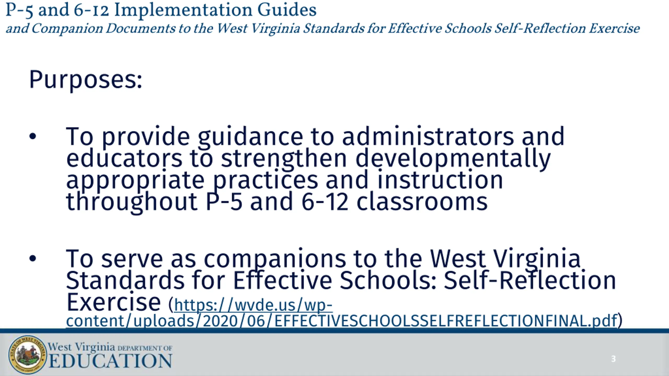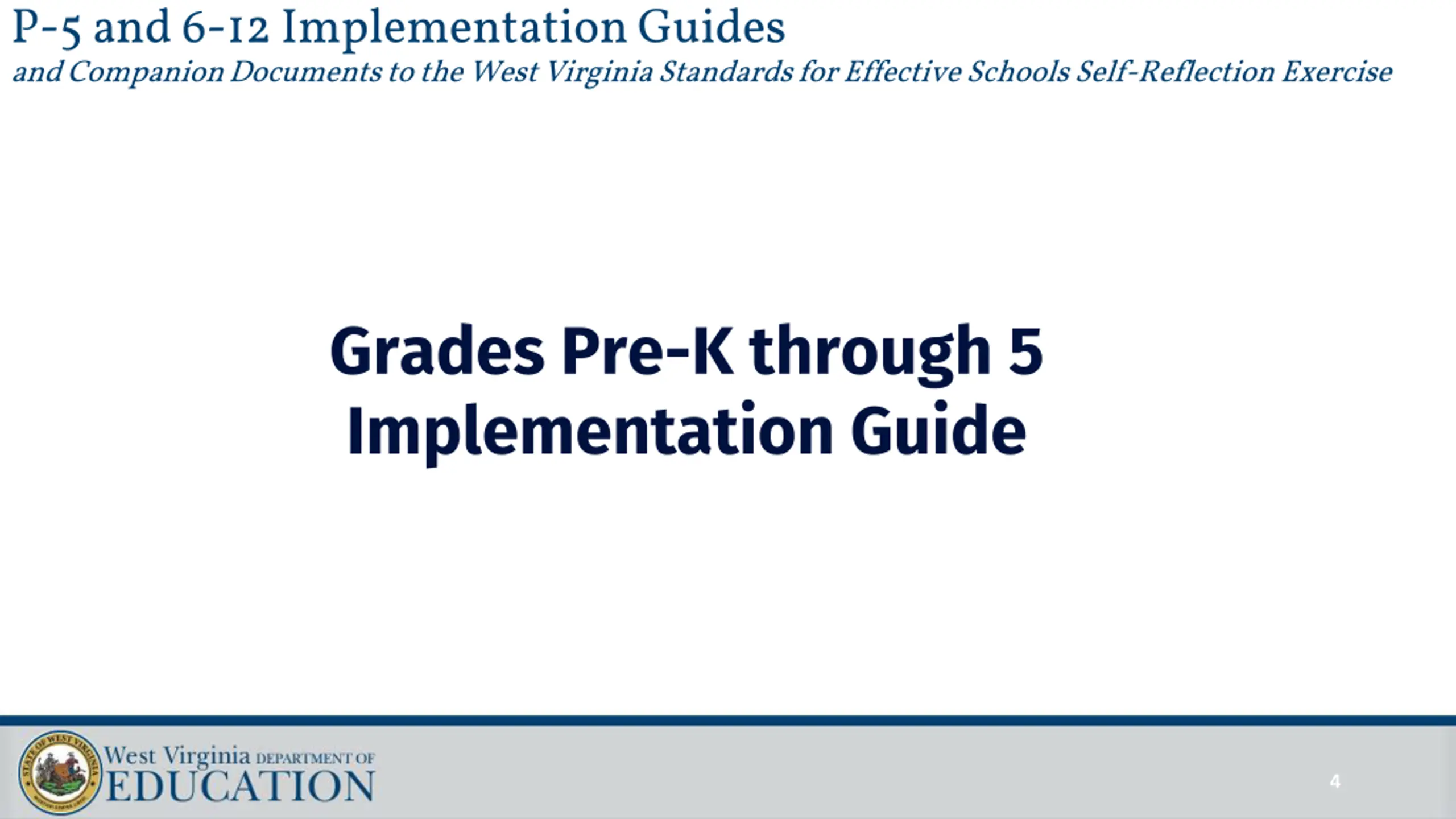 P-5 and 6-12 Implementation Guides and Companion Documents to the West Virginia Standards for Effective Schools Self-Reflection Exercise Purposes: To provide guidance to administrators and educators to strengthen developmentally appropriate practices and instruction throughout P-5 and 6-12 classrooms To serve as companions to the West Virginia Standards for Effective Schools: Self-Reflection Exercise (https://wvde.us/wp- content/uploads/2020/06/EFFECTIVESCHOOLSSELFREFLECTIONFINAL.pdf) 3