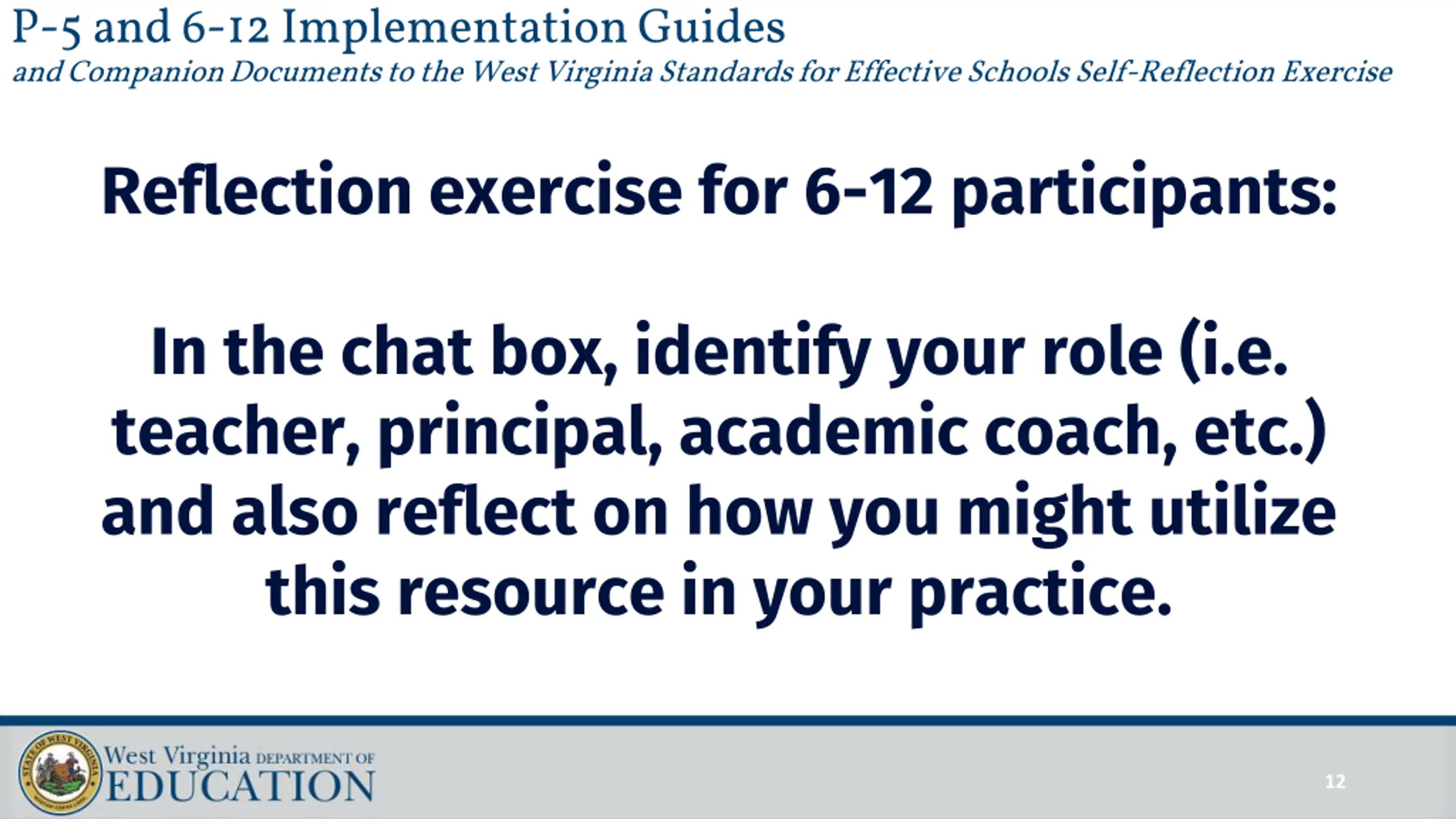 P-5 and 6-12 Implementation Guides and Companion Documents to the West Virginia Standards for Effective Schools Self-Reflection Exercise Reflection exercise for 6-12 participants: In the chat box, identify your role (i.e. teacher, principal, academic coach, etc.) and also reflect on how you might utilize this resource in your practice. 12