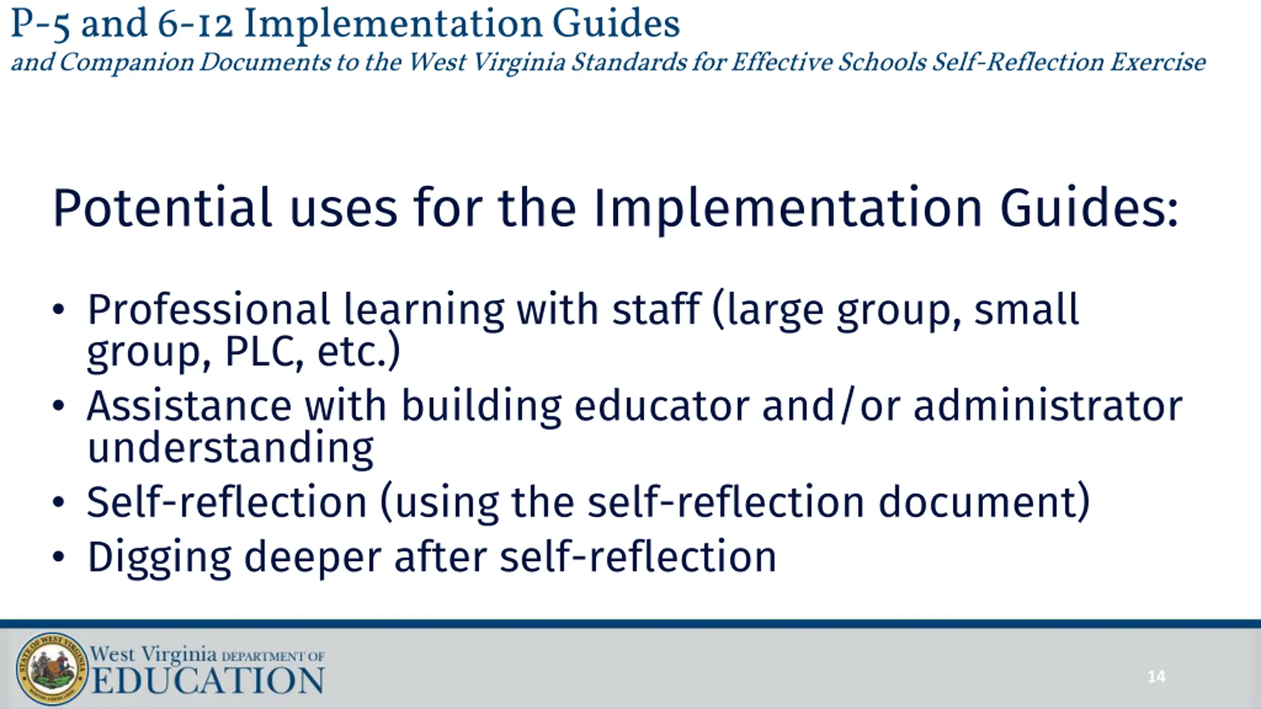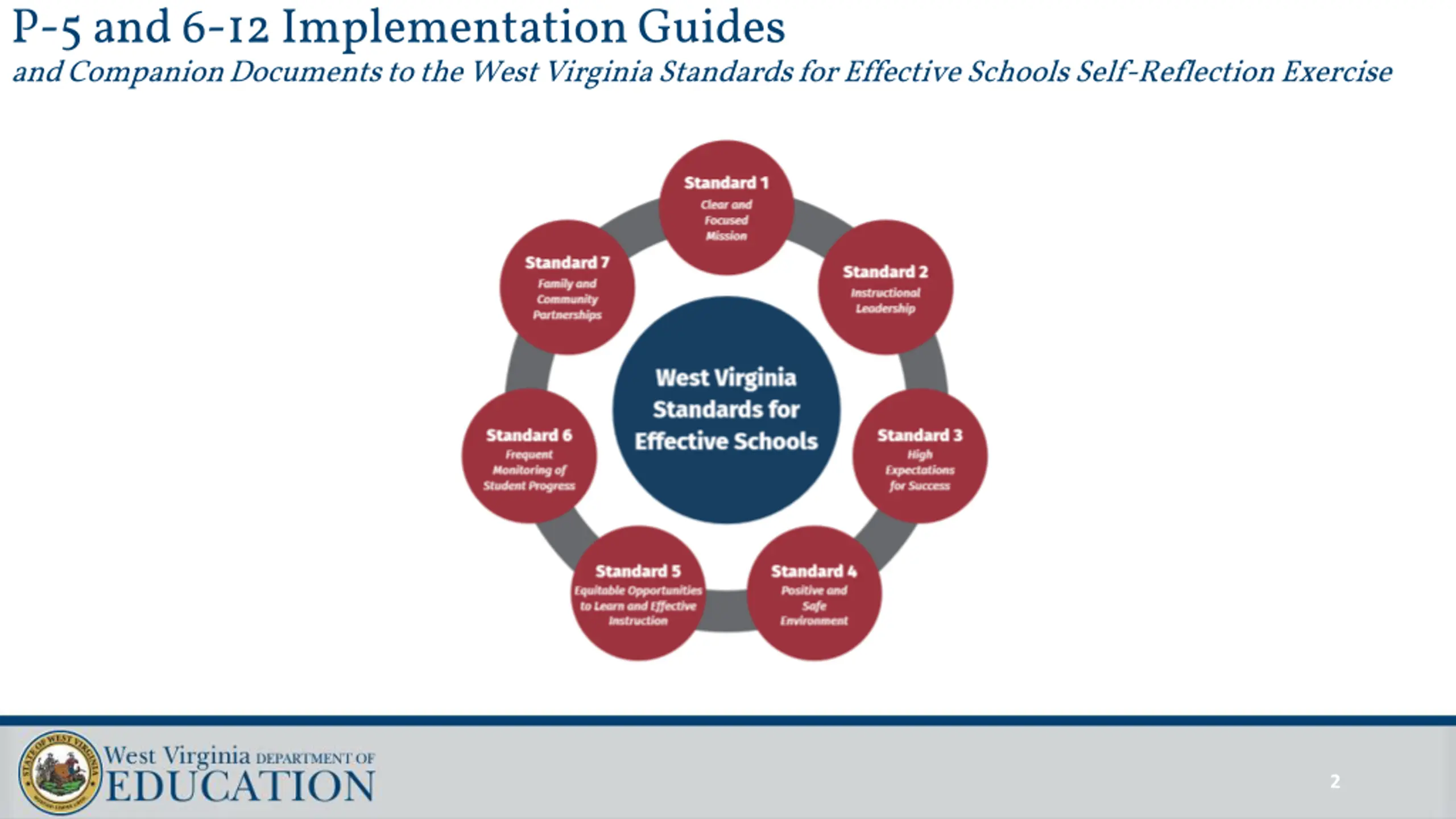 Overview of the West Virginia Implementation Guides for P-5 and 6- 12 and Companion Documents to the West Virginia Standards for Effective Schools Self-Reflection Exercise August 2020 Instructional Support Professional Learning Forum