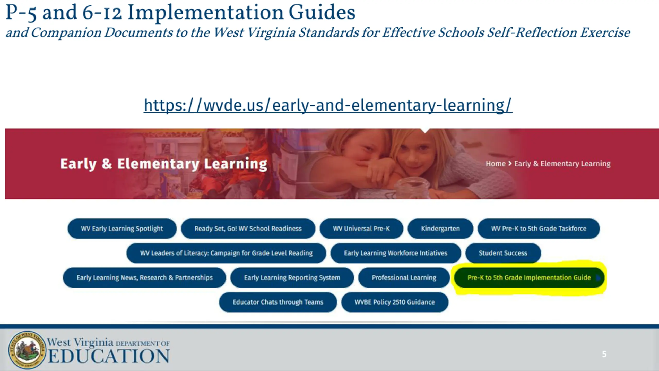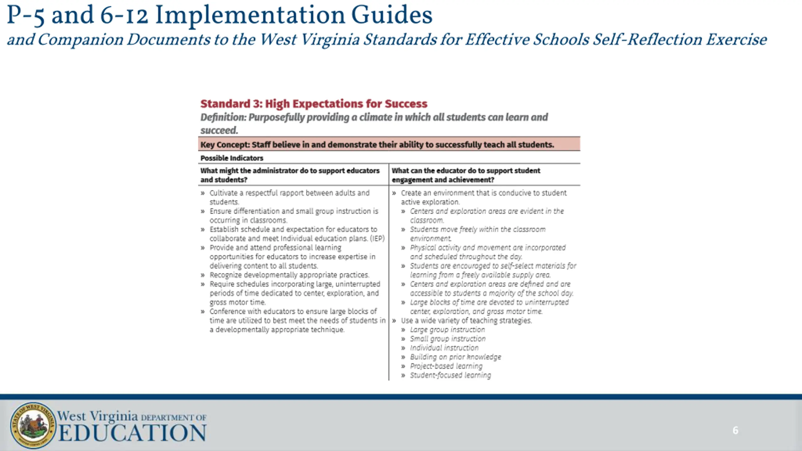 P-5 and 6-12 Implementation Guides and Companion Documents to the West Virginia Standards for Effective Schools Self-Reflection Exercise https://wvde.us/early-and-elementary-learning/ 5