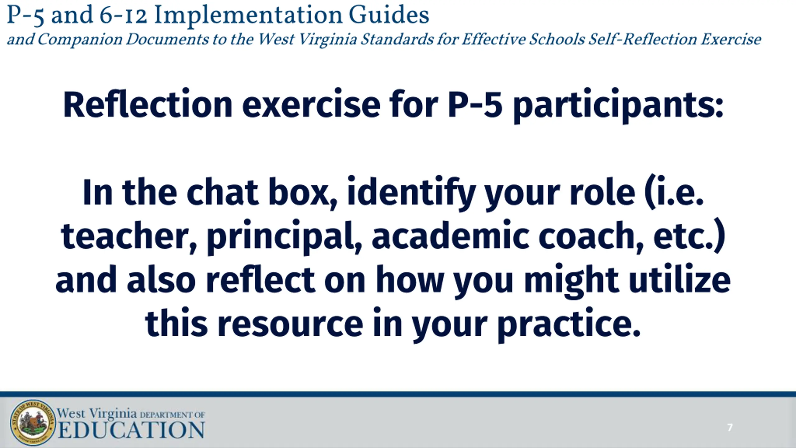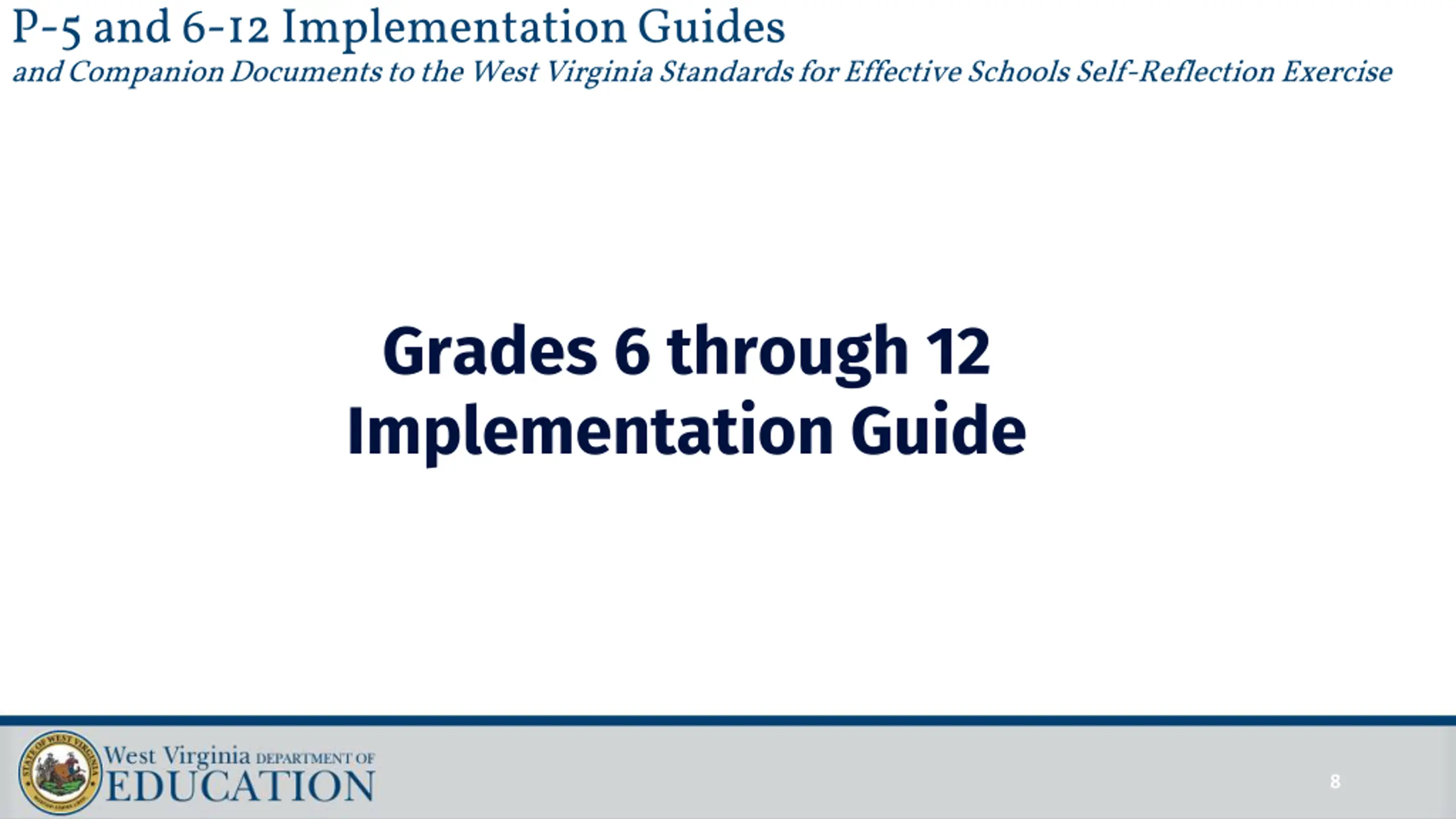 P-5 and 6-12 Implementation Guides and Companion Documents to the West Virginia Standards for Effective Schools Self-Reflection Exercise Reflection exercise for P-5 participants: In the chat box, identify your role (i.e. teacher, principal, academic coach, etc.) and also reflect on how you might utilize this resource in your practice. 7