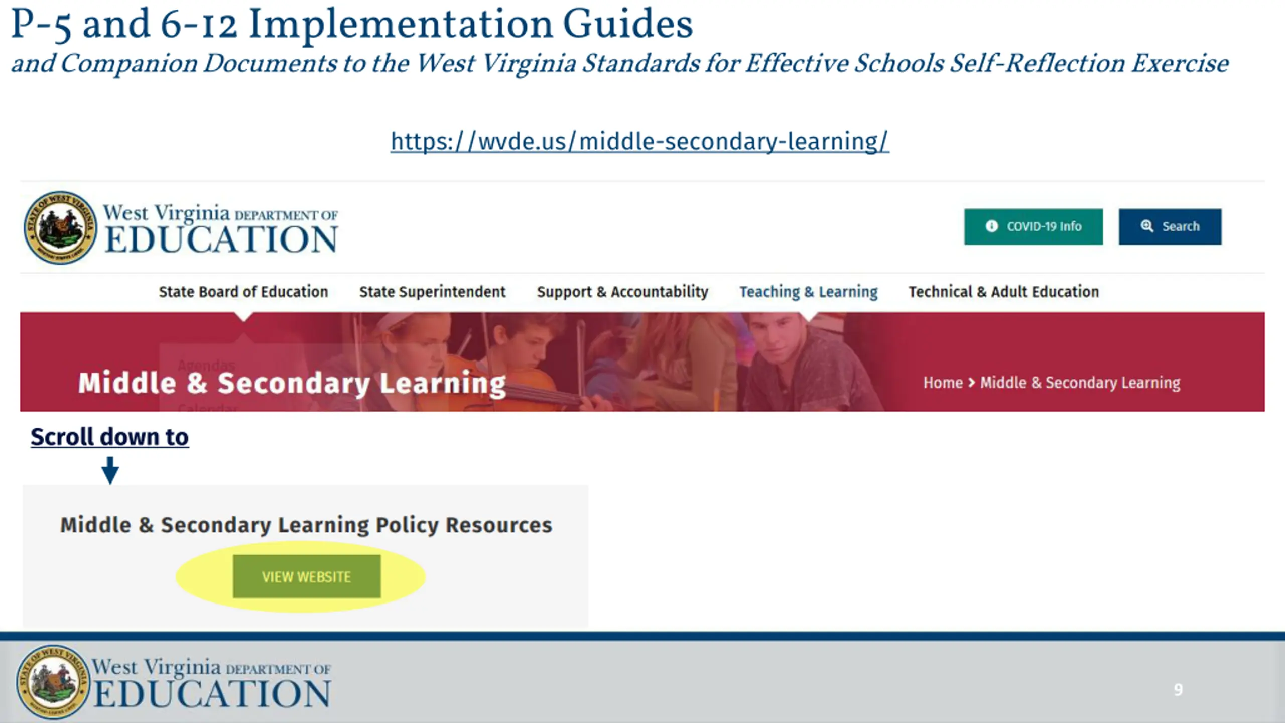P-5 and 6-12 Implementation Guides and Companion Documents to the West Virginia Standards for Effective Schools Self-Reflection Exercise https://wvde.us/middle-secondary-learning/ Scroll down to 9