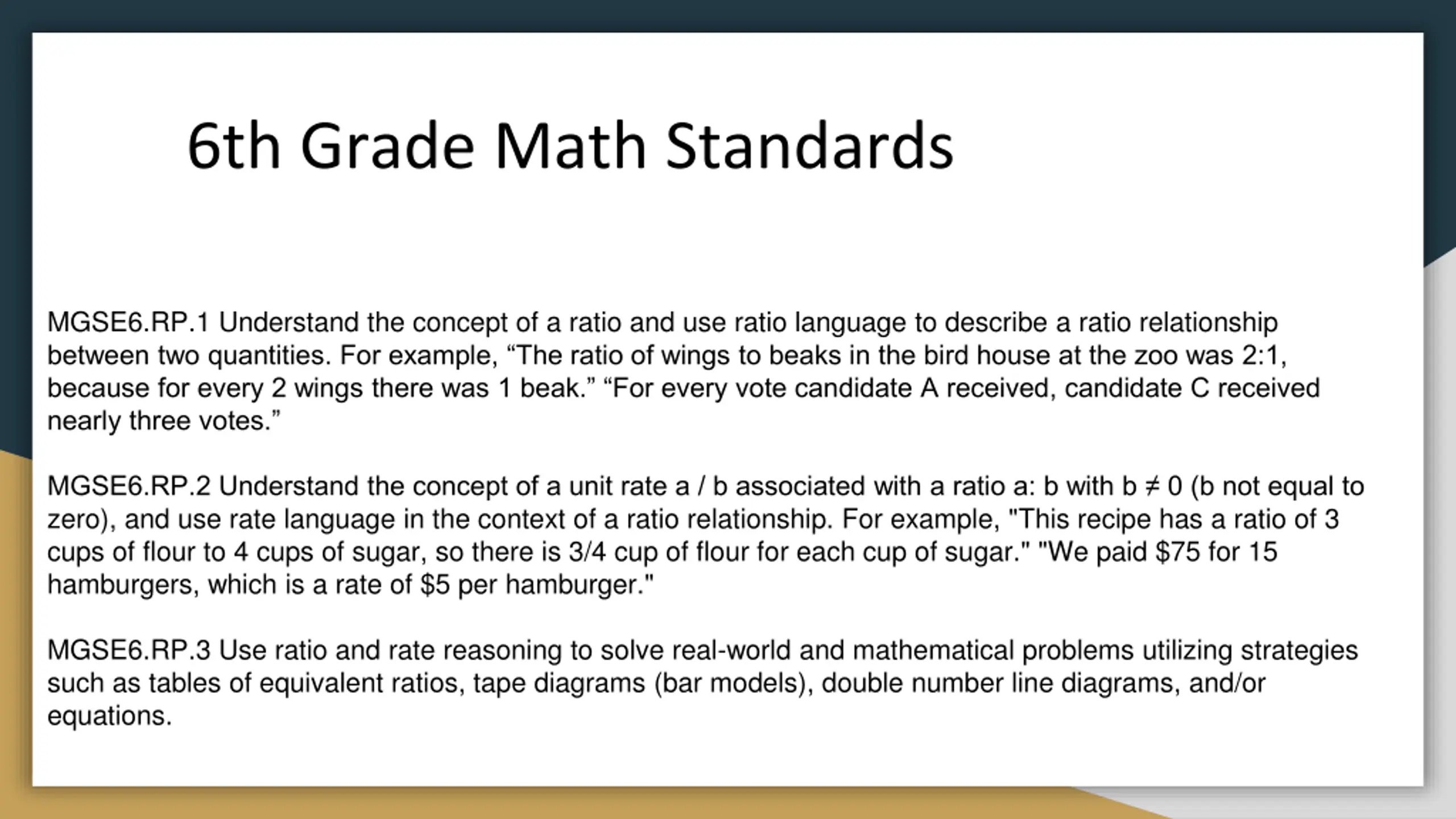 6th Grade Math Standards MGSE6.RP.1 Understand the concept of a ratio and use ratio language to describe a ratio relationship between two quantities. For example, The ratio of wings to beaks in the bird house at the zoo was 2:1, because for every 2 wings there was 1 beak. For every vote candidate A received, candidate C received nearly three votes. MGSE6.RP.2 Understand the concept of a unit rate a / b associated with a ratio a: b with b 0 (b not equal to zero), and use rate language in the context of a ratio relationship. For example, "This recipe has a ratio of 3 cups of flour to 4 cups of sugar, so there is 3/4 cup of flour for each cup of sugar." "We paid $75 for 15 hamburgers, which is a rate of $5 per hamburger." MGSE6.RP.3 Use ratio and rate reasoning to solve real-world and mathematical problems utilizing strategies such as tables of equivalent ratios, tape diagrams (bar models), double number line diagrams, and/or equations.