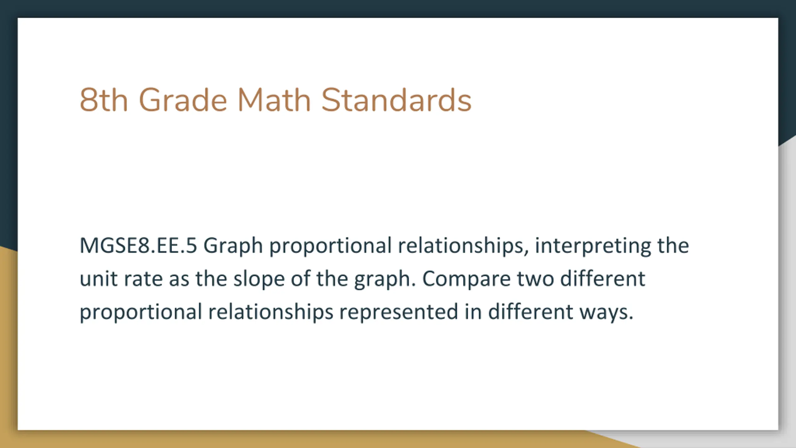 8th Grade Math Standards MGSE8.EE.5 Graph proportional relationships, interpreting the unit rate as the slope of the graph. Compare two different proportional relationships represented in different ways.