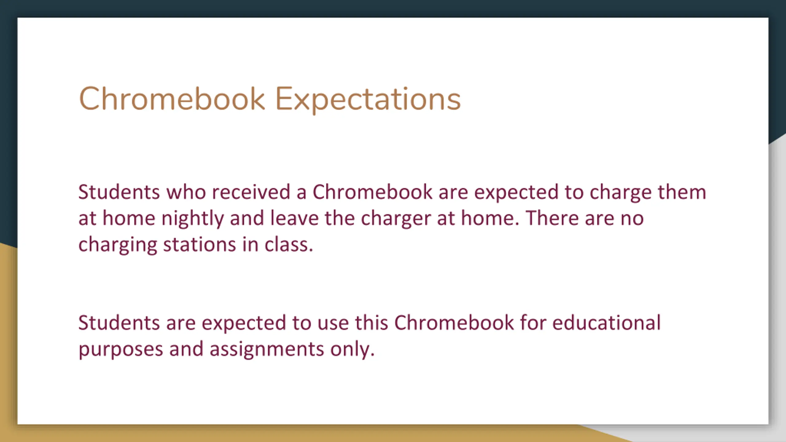 Chromebook Expectations Students who received a Chromebook are expected to charge them at home nightly and leave the charger at home. There are no charging stations in class. Students are expected to use this Chromebook for educational purposes and assignments only.